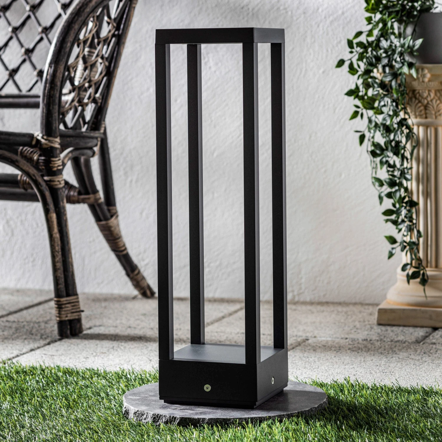 Carlota bereichert Gärten und Hofeinfahrten vor allem dann, wenn sie in einem modernen Stil gehalten sind, denn der Leuchtenkorpus ist ganz geradlinig und durchscheinend gestaltet worden. Statt eines durchgängigen Schirms bzw. Gestells präsentiert sich diese LED-Sockelleuchte lediglich als dreidimensionaler Rahmen mit guter Durchsicht und einem Ausdruck von besonderer Leichtigkeit. Die LED sitzt im oberen Teil und das Licht wird nach unten abgestrahlt, ohne dass man sie in normaler Laufhöhe direkt zu Gesicht bekommt oder gar von ihrem Licht geblendet wird. Im Gegenteil, die Beleuchtung wird im Außenbereich als absolut angenehm empfunden und dient einer guten Orientierung die ganze Nacht hindurch.