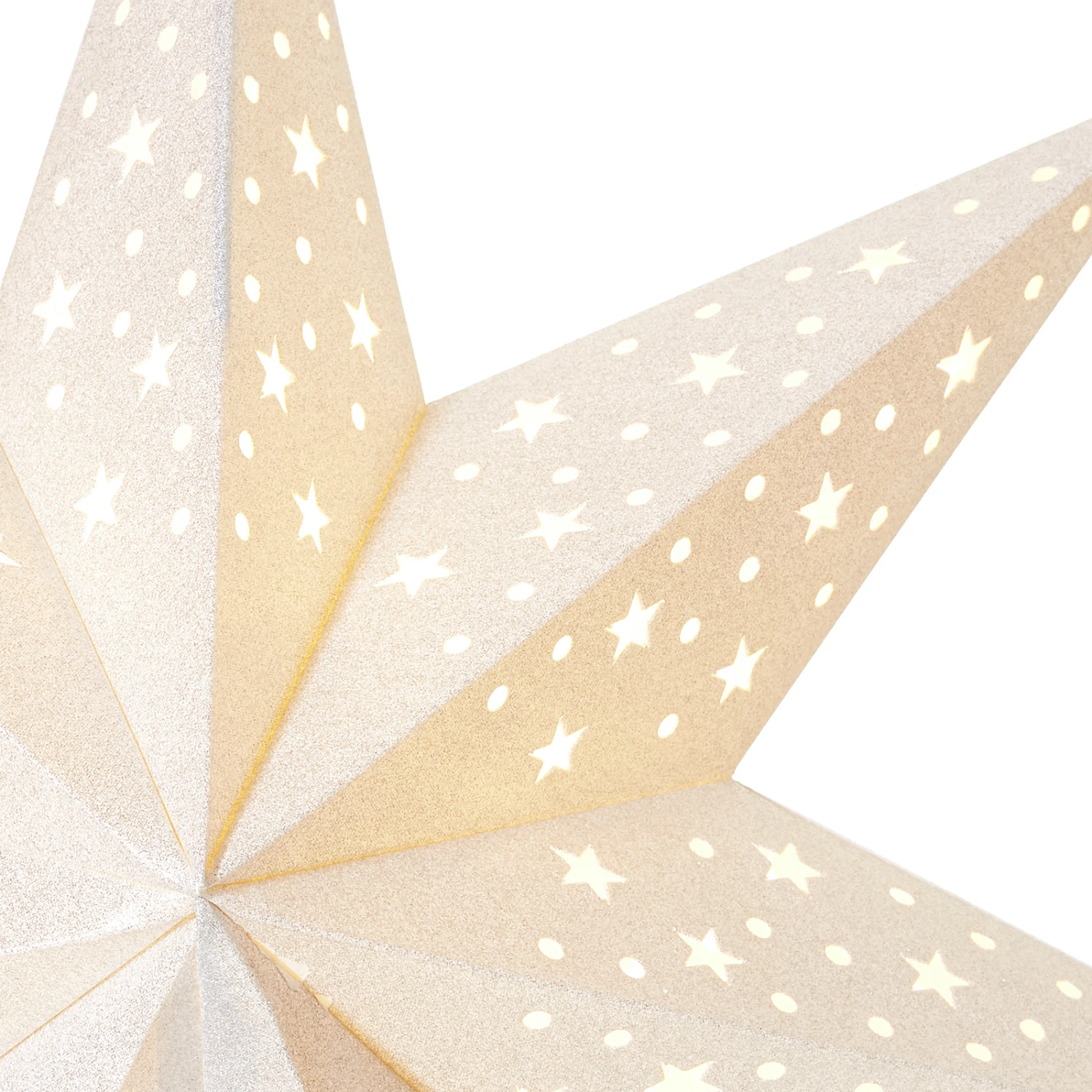 Der Stand-Stern Solvalla besteht aus einem aus Holz gearbeiteten Fuß, der Stern mit den sieben breiten Zacken ist aus Papier gefertigt und mit einem hübschen Stern- und Punktmuster versehen, das erst im abstrahlenden Licht seinen kompletten Reiz entfaltet.