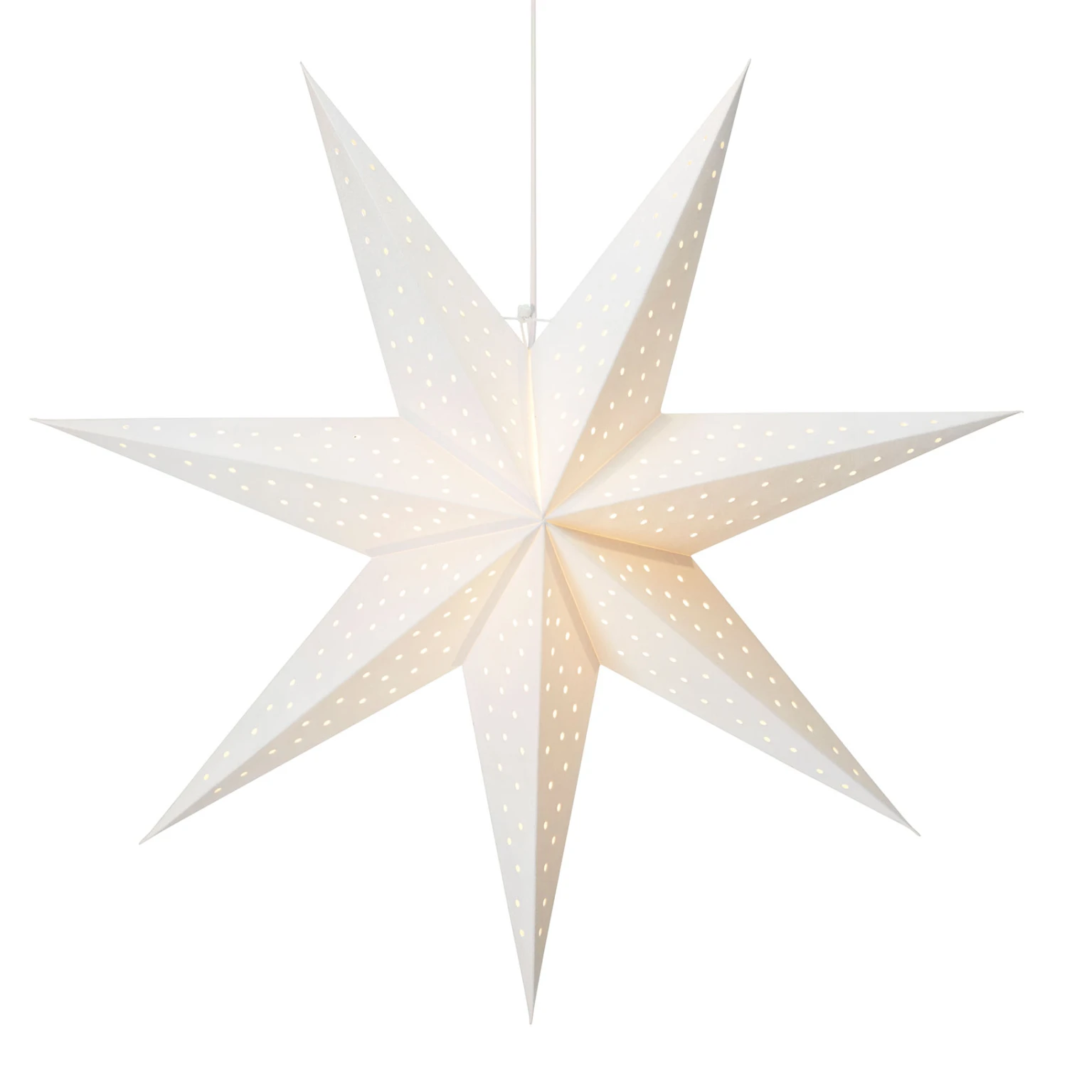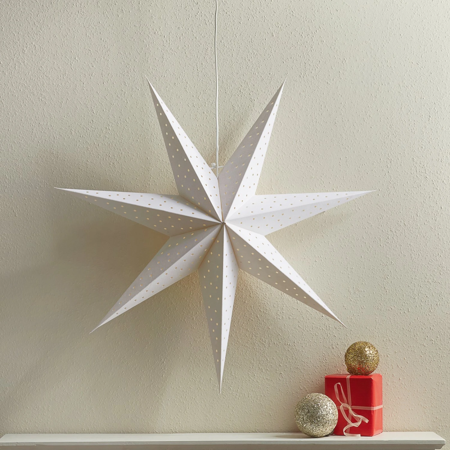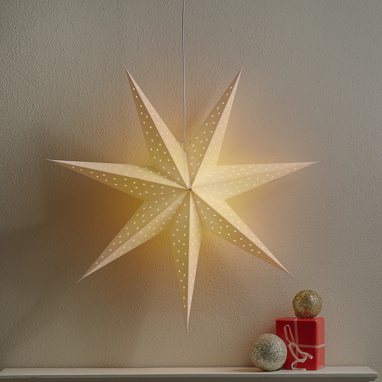 Dieser große Stern wird an jedem Ort in der Wohnung zum absoluten Hingucker und das nicht nur in der Weihnachtszeit. Der Stern aus Papier, das mit einem Lochmuster versehen wurde, eignet sich ideal als Fensterdekoration, wirkt aber auch an jedem anderen Platz sehr auffallend, vor allem dann, wenn die Beleuchtung eingeschaltet wird und den Stern perfekt in Szene setzt.