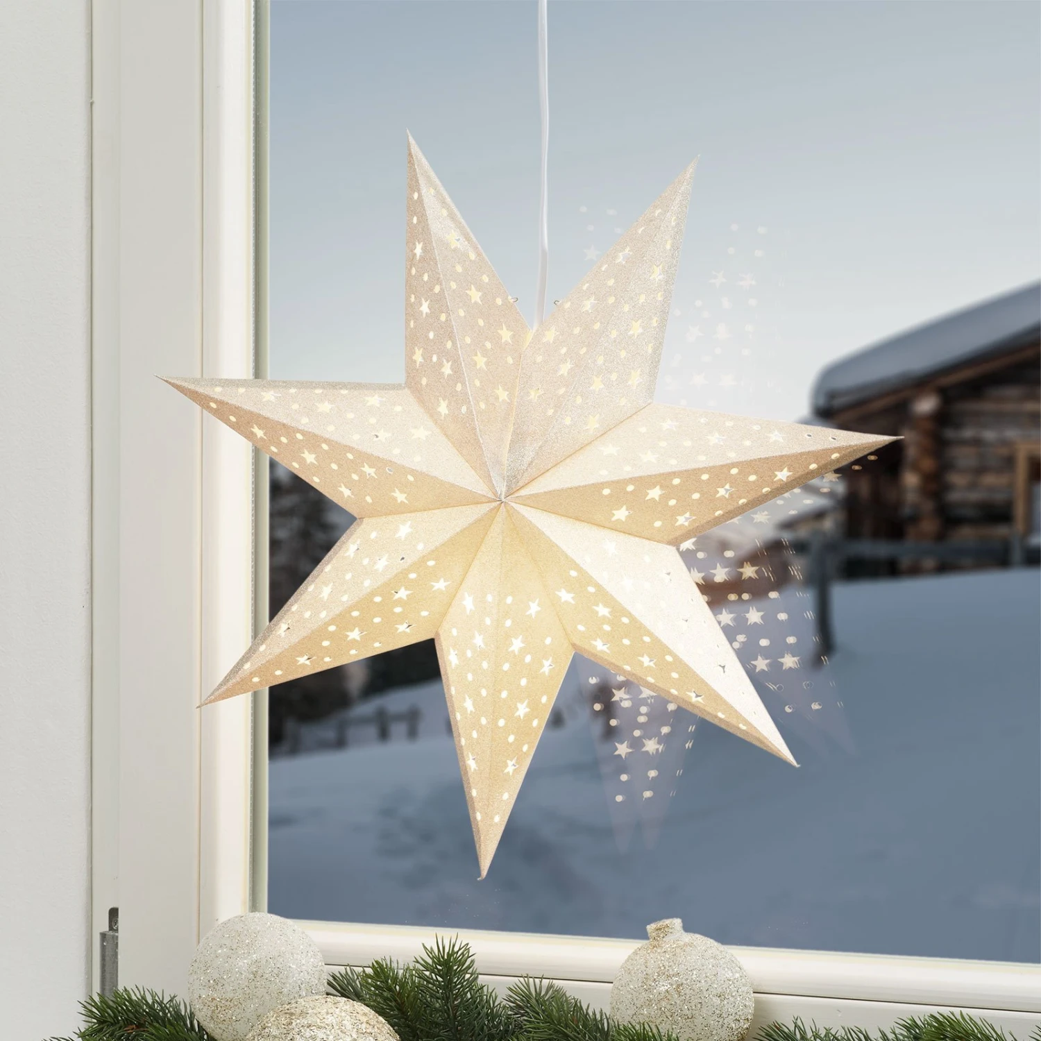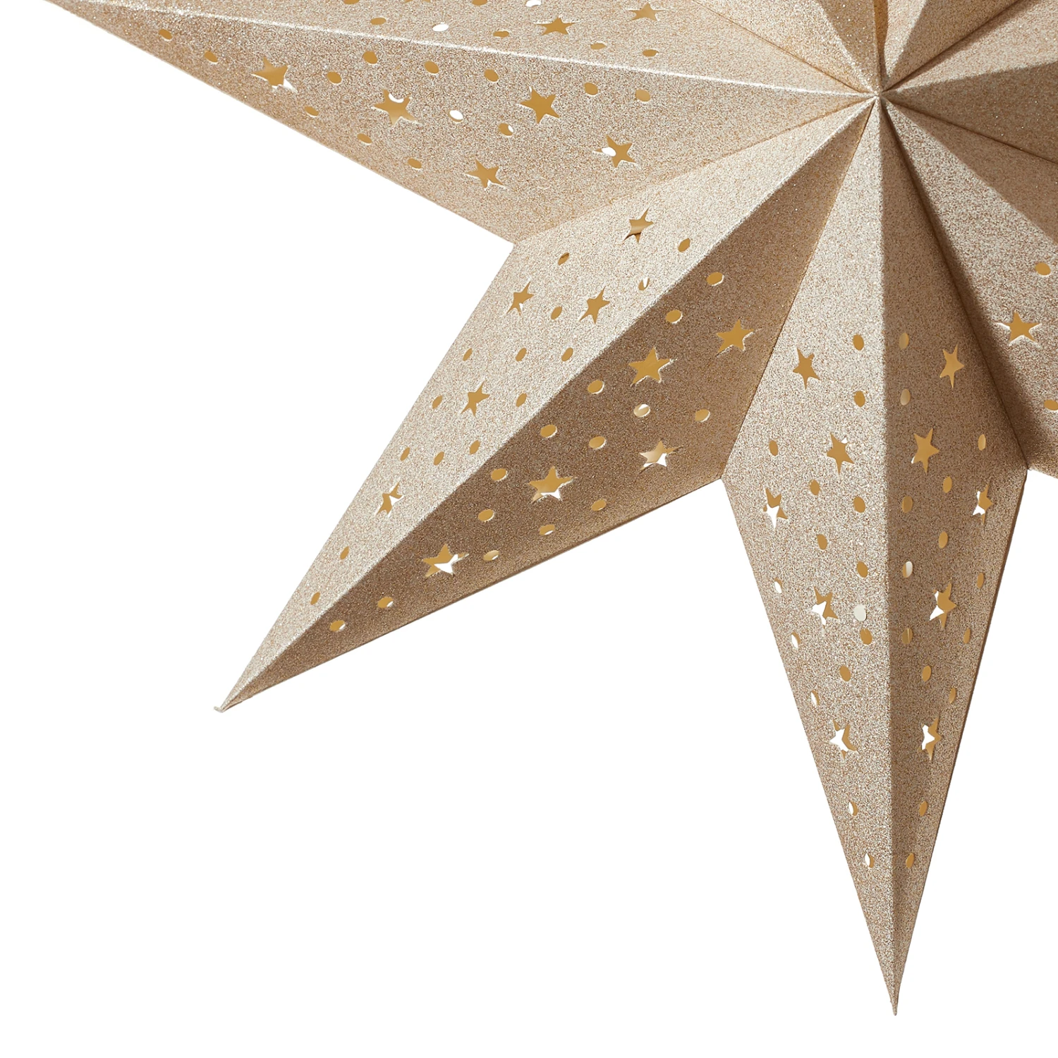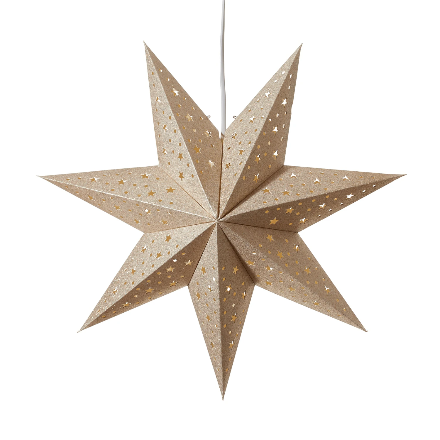 Gold ist eine der beliebtesten Dekorationsfarben rund um das Weihnachtsfest. Es wirkt festlich und geheimnisvoll zugleich. So wie der siebenzackige Papierstern Solvalla mit dem Loch- und Sterndurchbruchmuster, der ausgeschaltet schon sehr schön aussieht. Wird das Licht eingeschaltet, entfaltet sich die komplette Faszination dieses attraktiven Sterns.
