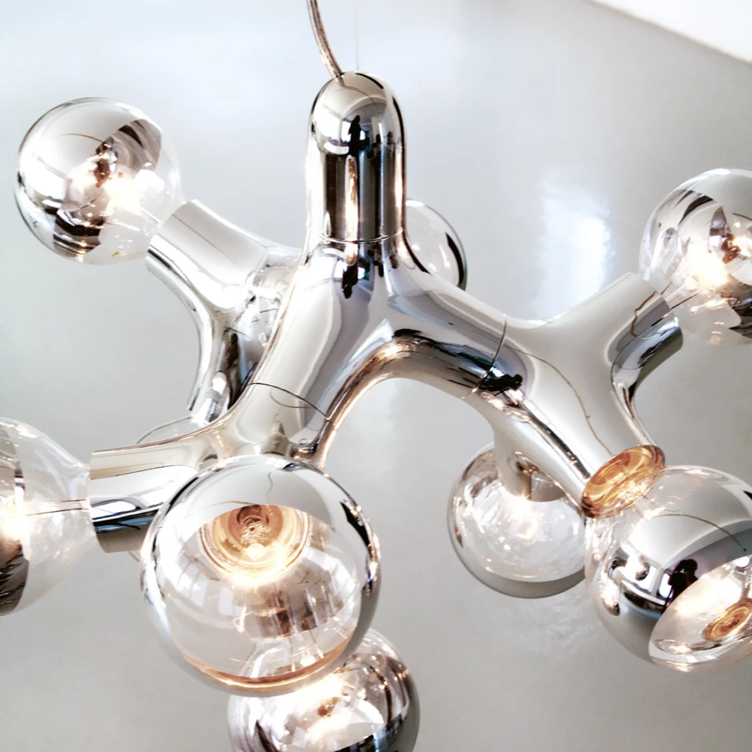 Fernab dessen, was man bei der Optik eines Kronleuchters erwartet, präsentiert sich das Kronleuchter-Modell aus der Leuchtenserie DNA als untypisches Beispiel für seine Kategorie. Statt gerader, nach oben gerichteter Leuchtkerzen mit Schirmchen ist DNA Chandelier mit insgesamt neun Lichtstellen in Form von Globe-Leuchtmitteln (exklusive) ausgestattet, die alle in verschiedene Richtungen zeigen. Dies ist dem Design geschuldet, das sich Hopf & Wortmann, die Designer von DNA, für ihre Kreation ausgedacht haben.