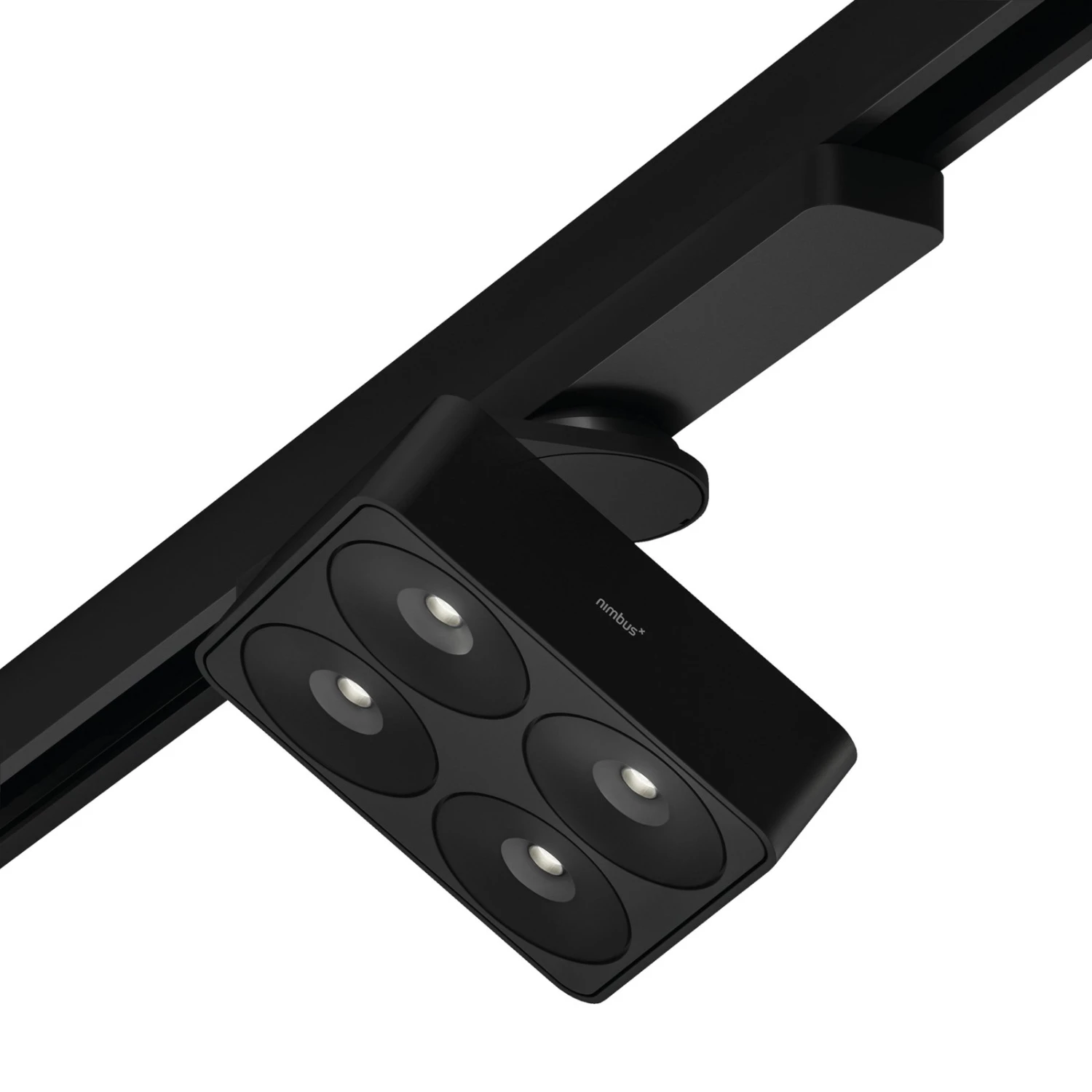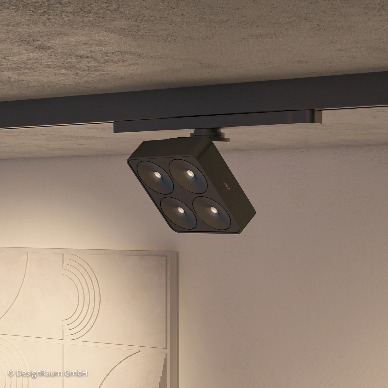Der Q Four TT Track LED-Strahler verfügt über einen beweglichen Korpus. In das quadratische Aluminiumgehäuse mit abgerundeten Ecken sind vier High-Power LEDs mit Bartenbach-Linsen zur Lichtbündelung und Entblendung integriert. Die Lichtaustrittsöffnungen lassen das Licht eng abstrahlen. Zudem lässt sich die Leuchte um ca. 335° drehen und 60° schwenken. Diese Kombination bewirkt eine präzise Beleuchtung spezifischer Bereiche im Raum. Das Design ist mit vielen Features gespickt, doch es ist nicht nur funktional, sondern auch ansprechend. Etwas worauf man bei Nimbus stolz sein kann. Der Hersteller verbindet formale Qualität mit charakteristischer Designsprache.