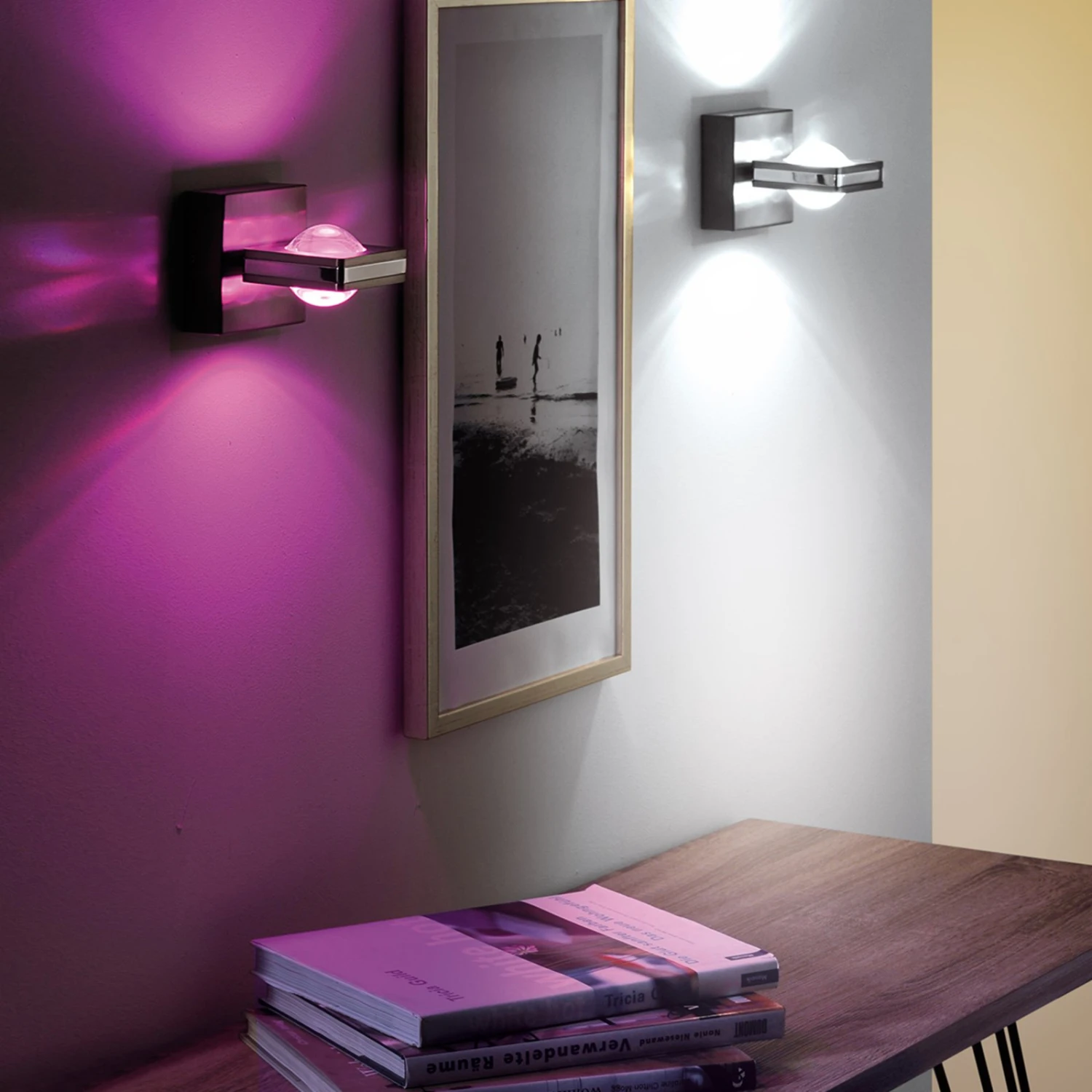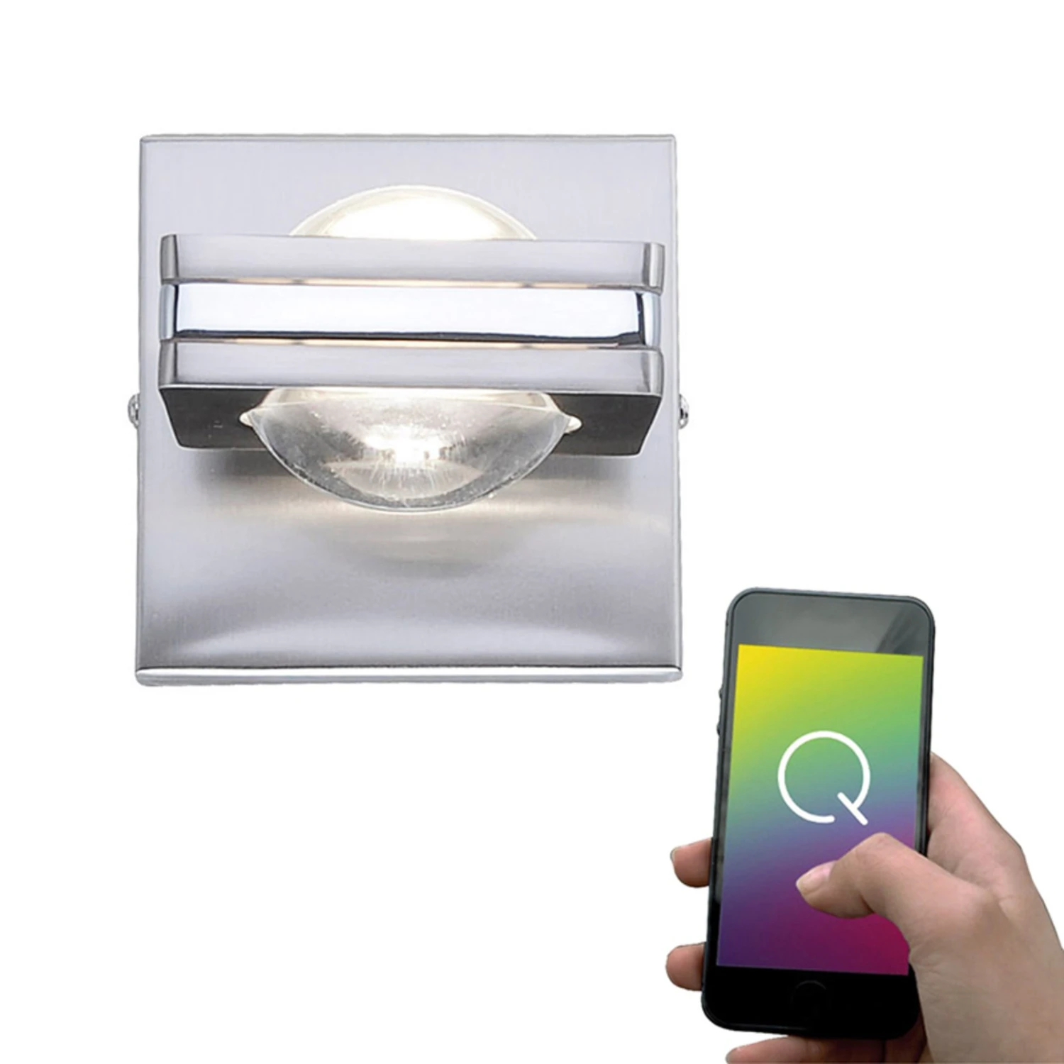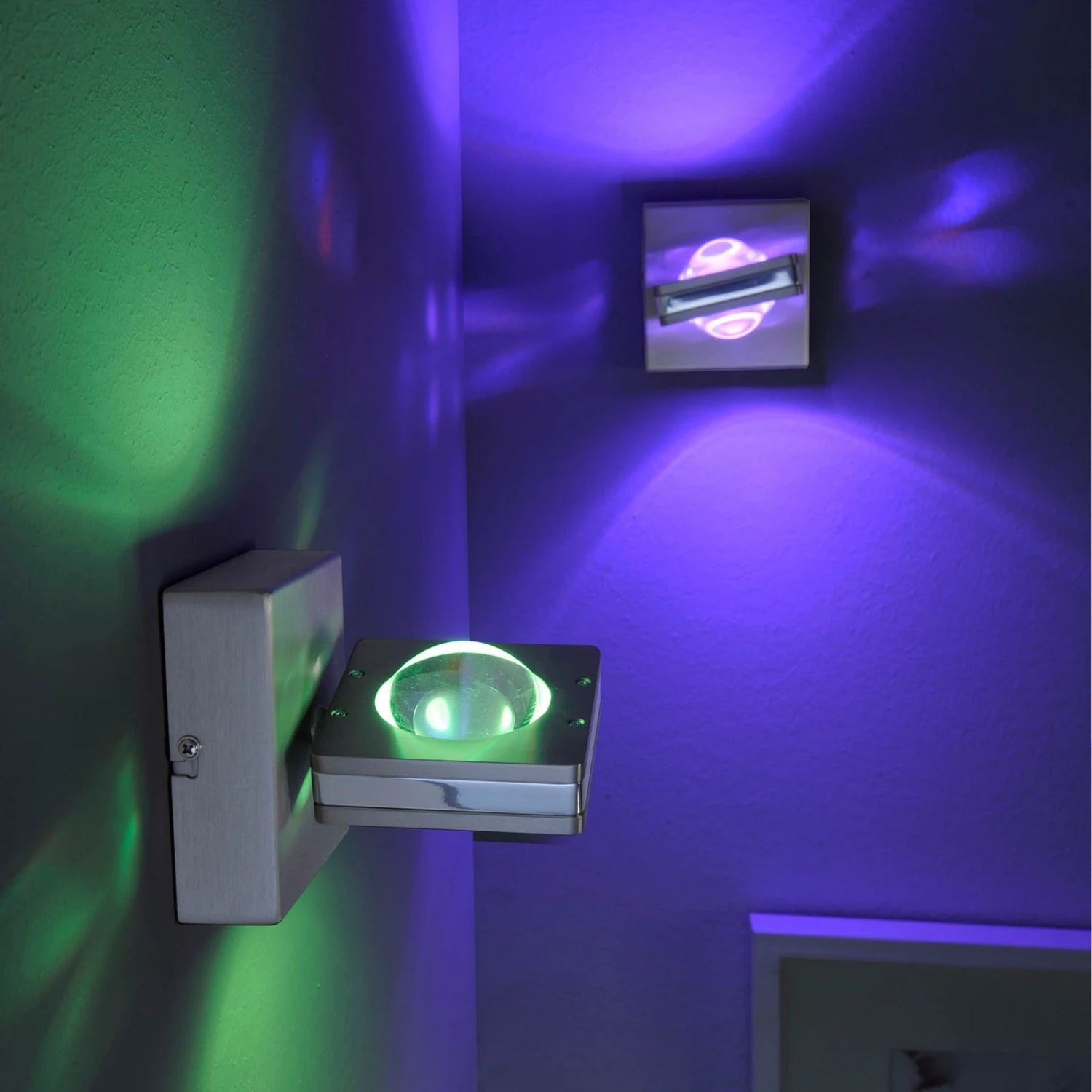 Sehr puristisch wurde die moderne LED-Wandleuchte Fisheye aus Stahl mit verchromtem Zierrand gestaltet. Sie wirft durch die konvexen Glaslinsen gebündeltes Licht in Form eines Kegels nach oben und unten an die Wand, wobei sich der Leuchtenkopf in der Halterung um 320° drehen lässt. Variable Beleuchtung bieten die verbauten LEDs, die sich über die im Lieferumfang enthaltene Fernbedienung in den unterschiedlichsten Lichtfarben und Intensitäten schalten lassen. So lässt sich über die Taste „W“ der Fernbedienung die warmweiße Lichtfarbe auswählen und über den Drehregler eine aus über 16 Millionen bunten Lichtfarben. Jede Farbe kann in der Helligkeit stufenlos gedimmt werden. Mit der LED-Wandleuchte Fisheye kann in Wohnräumen, Fluren oder im Schlafzimmer immer die der Tageszeit oder Stimmung und Situation passende Beleuchtung ausgewählt und ein wirkungsvolles Highlight an der Wand gesetzt werden.