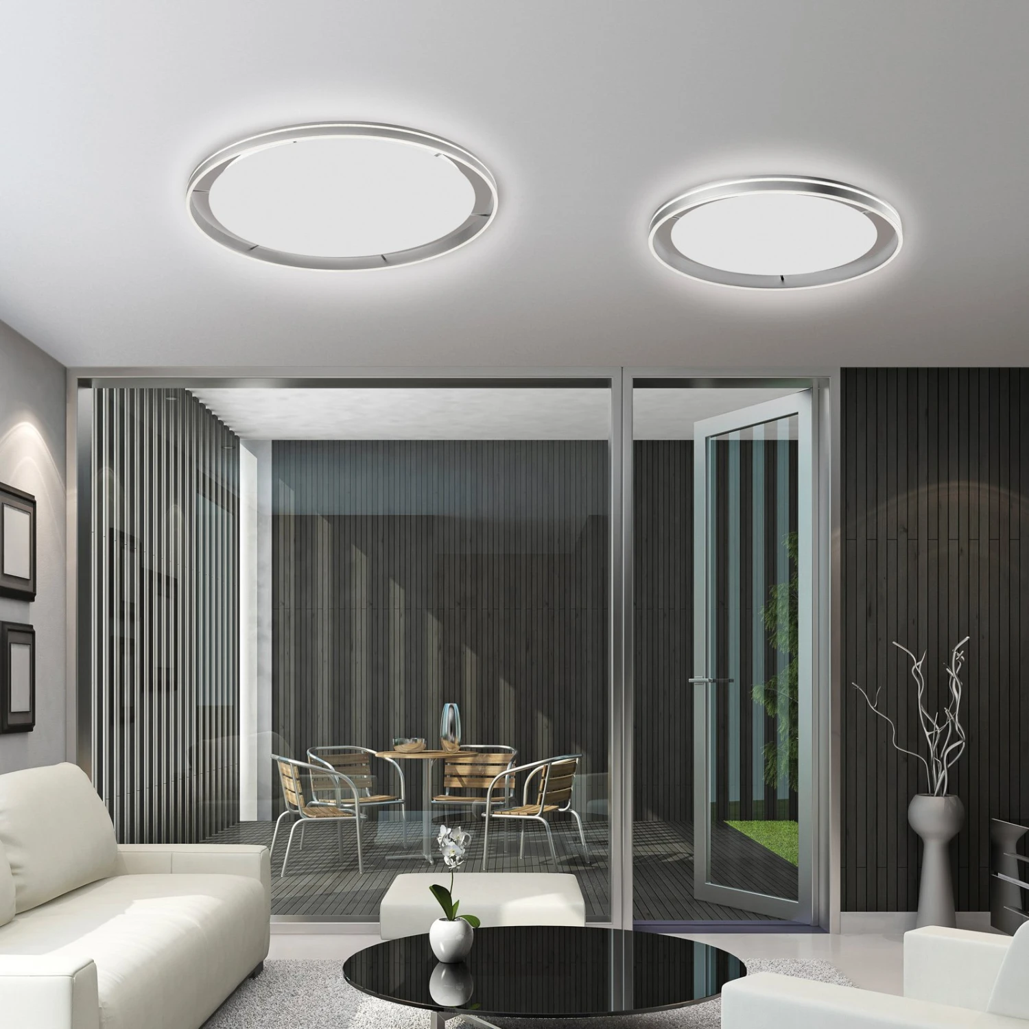 Der kreisförmige Rahmen aus Metall, welcher mit zwei seitlich und nach unten orientierten leuchtenden Ringen ausgestattet ist, verleiht der LED-Deckenleuchte eine moderne Optik. Diese geht Hand in Hand mit nützlichen technischen Features.
