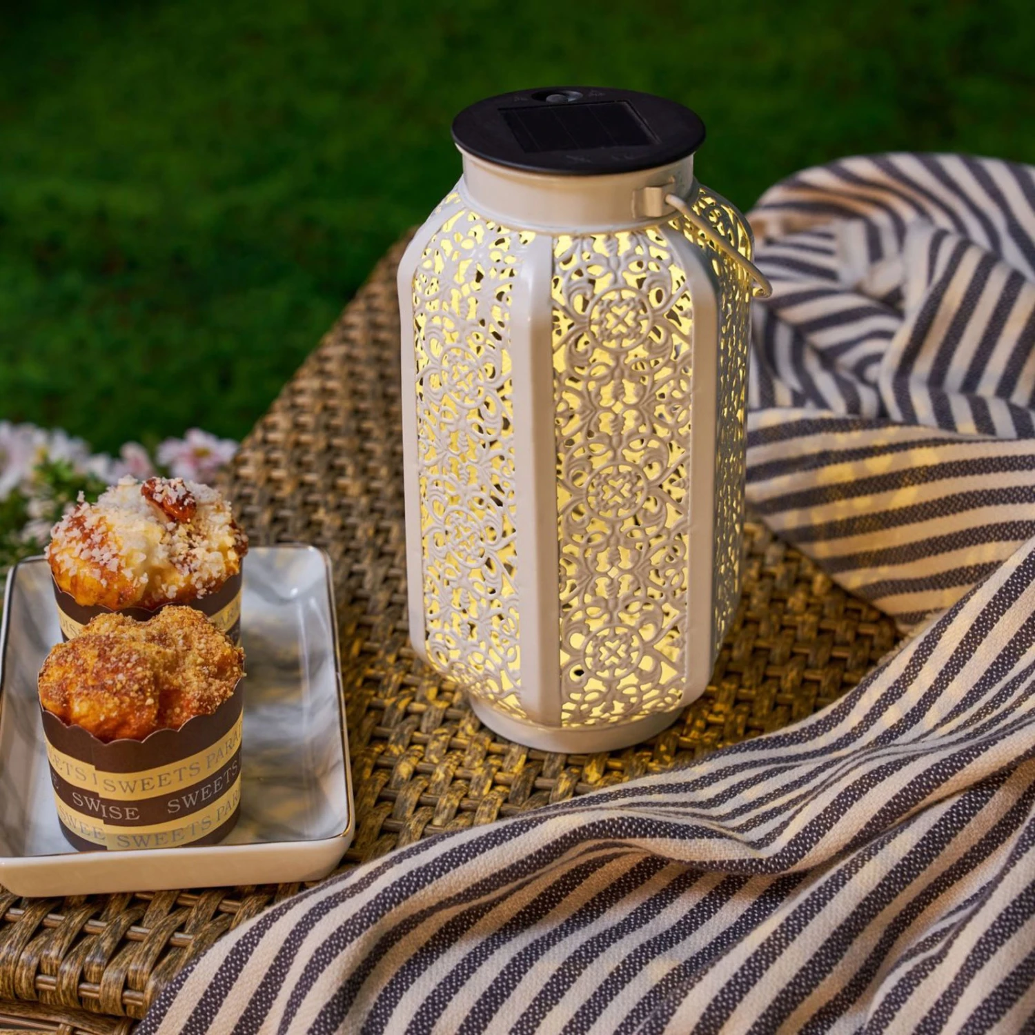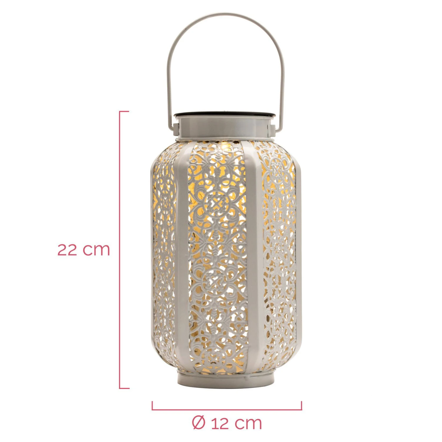 Die Solarleuchte Sunshine Kiss begeistert mit ihrer weißen Vintage-Oberfläche, die mit ihrer Musterung romantische Lichteffekte zaubert. Die Laterne lädt sich tagsüber im Sonnenlicht auf und schaltet sich bei Dämmerung automatisch ein. Die Leuchtdauer beträgt bis zu 8 Stunden täglich. Die Lampe schafft eine gemütliche Atmosphäre im Außenbereich. Der Korpus wird aus hochwertigem Metall gefertigt. Dank des Henkels lässt sich die Solarleuchte z.B. auch an Ästen aufhängen. Für Solarleuchten wird keine Montage bzw. Kabel benötigt.