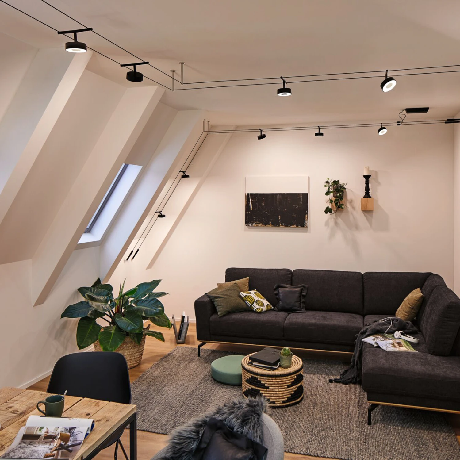 Circle ist ein LED-Seilsystem, das als anschlussfertiges Komplettset geliefert wird. Es besteht aus Seil, Trafo und fünf kreisrunden, flachen Leuchtenköpfen, die sich an den Halterungen schwenken lassen und in beliebiger Anordnung am Seil positioniert werden können, so dass auch größere oder verwinkelte Räume perfekt ausgeleuchtet werden können. Das System eignet sich sowohl zur Deckenmontage als auch zur Montage an der Wand oder an der Dachschräge. Die verbauten LEDs erzeugen ein warmweißes Licht und machen das System zu einer energieeffizienten Lichtquelle, die sich in vielen Räumen und Einrichtungsstilen anbringen lässt.