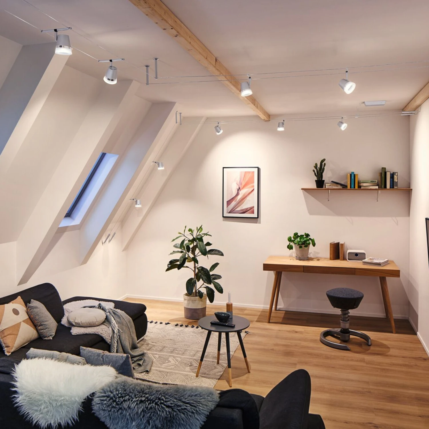 Mit dem Seilsystem Cone LED lässt sich jeder Raum effektiv und vor allem flexibel beleuchten. Ob gerade angebracht, an der Deckenschräge oder verwinkelt montiert – Seilsysteme bieten grenzenlose Gestaltungsmöglichkeiten und passen in jeden Raum. Das System besteht aus dem Seil, einem Trafo und fünf Leuchten, die sich beliebig am Seil anordnen lassen. Sie sind in leicht konisch zulaufender Form gestaltet und mit einem glänzenden Zierring sowie einem satinierten Ring an der Öffnung gearbeitet und lassen sich schwenken und drehen, so dass ihr Licht bis in jede Ecke eines Raumes reicht und sich verschiedene Raumbereiche oder Einrichtungsgegenstände gezielt beleuchten lassen.