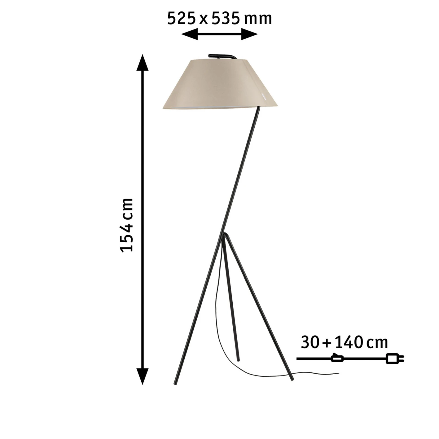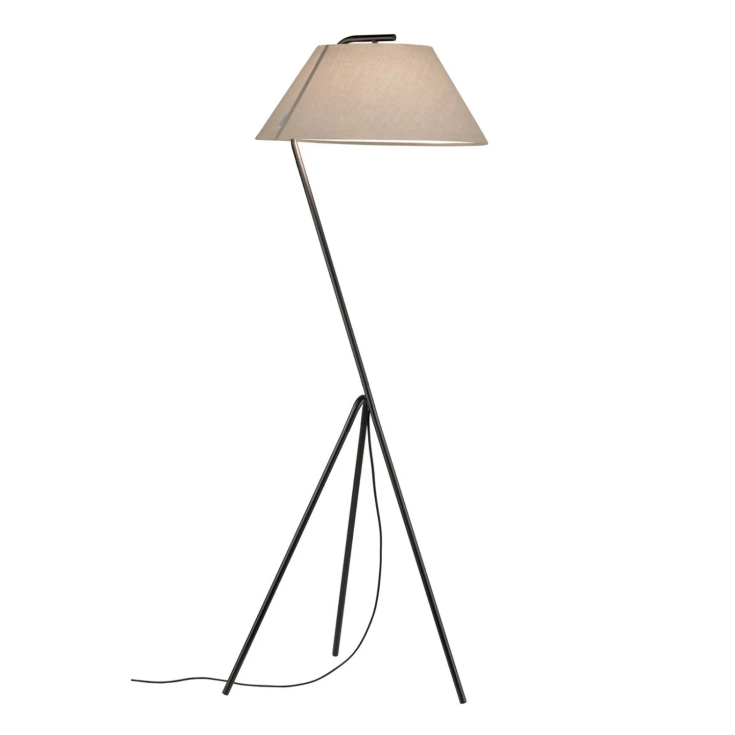 Die Stehleuchte Narve wird zum Blickfang durch ihren besonders geformten Leuchtenständer. Dieser ist aus schwarzem Metall und besteht aus drei Beinen, von denen eines weiter nach oben verläuft und sich um den Textilschirm biegt. Dadurch kann er den Leuchtenschirm von oben halten und wirkt dabei besonders filigran und elegant. Der Textilschirm in Beige ist nach unten hin ausladend und beherbergt eine E27-Fassung zur Bestückung nach Wahl. Narve ist eine dekorative Stehleuchte für Wohn- und Flurbereiche, die ein wohliges Licht verströmt.