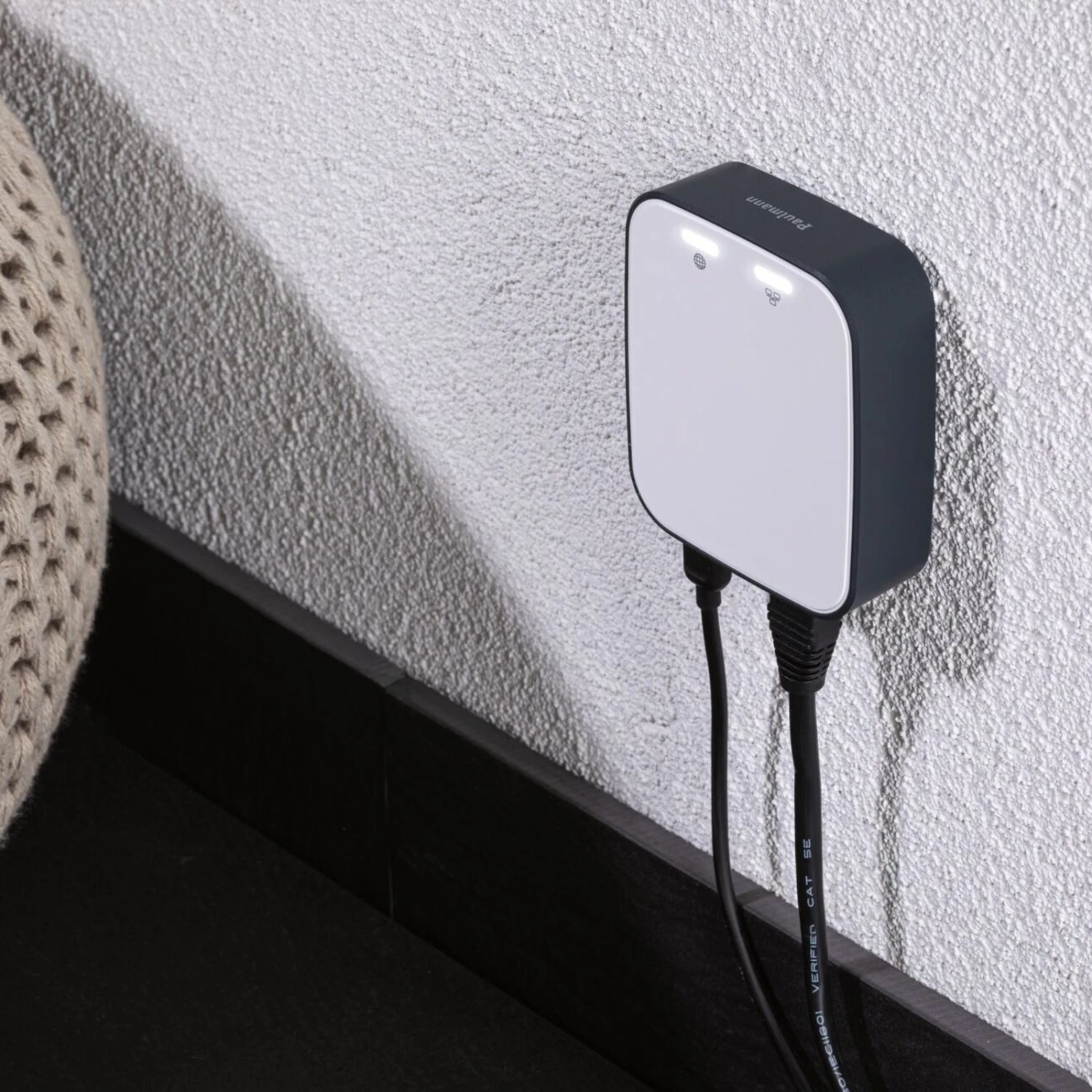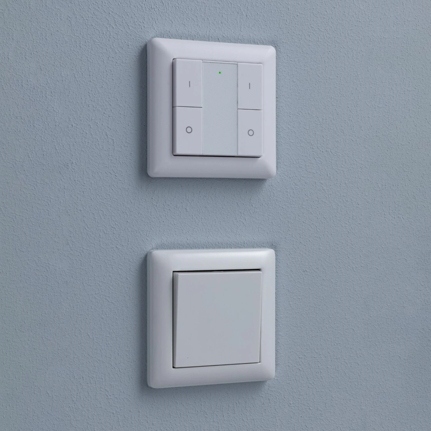 Der mitgelieferte Wandtaster kann ebenfalls zum Schalten und Dimmen verwendet werden. Er lässt sich wahlweise direkt mit den Leuchtmitteln koppeln oder smart einbinden, ist batteriebetrieben und passt in die Rahmen gängiger Markenschalter.