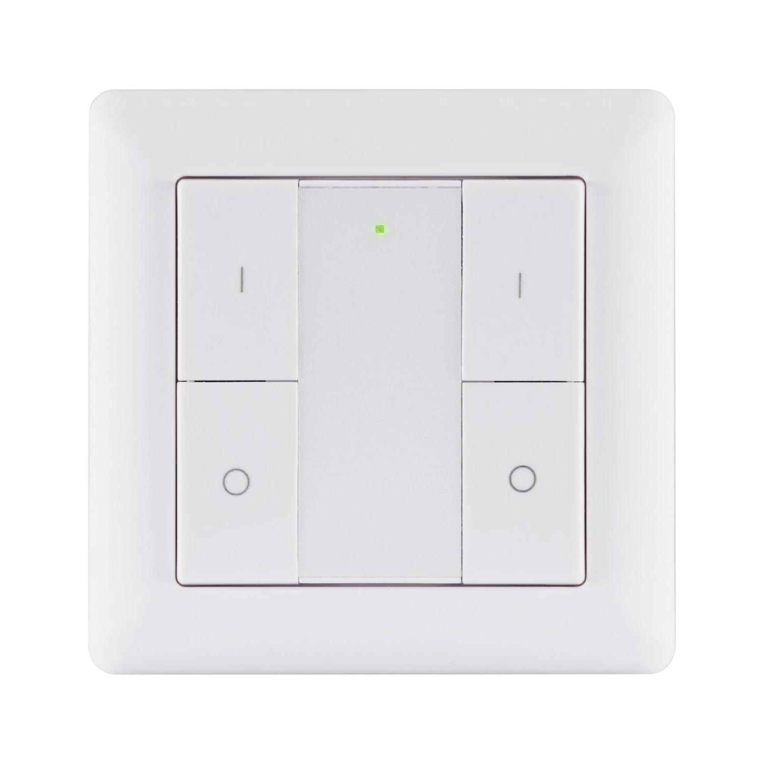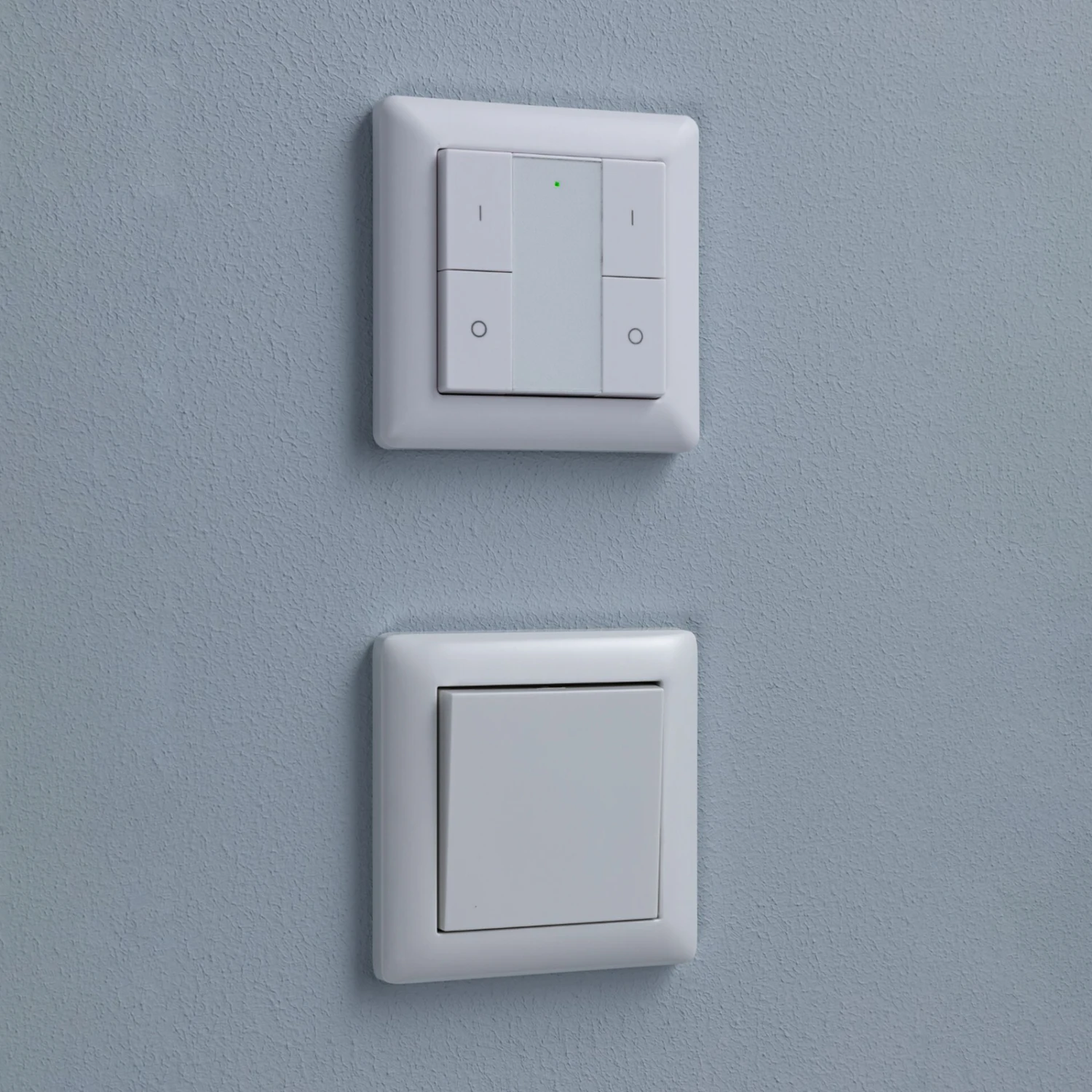 Der mitgelieferte Wandtaster kann ebenfalls zum Schalten und Dimmen verwendet werden. Er lässt sich wahlweise direkt mit den Leuchtmitteln koppeln oder smart einbinden, ist batteriebetrieben und passt in die Rahmen gängiger Markenschalter.