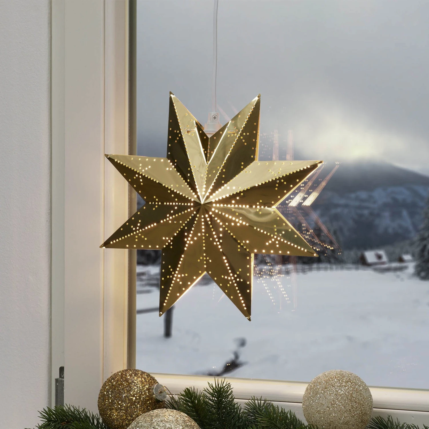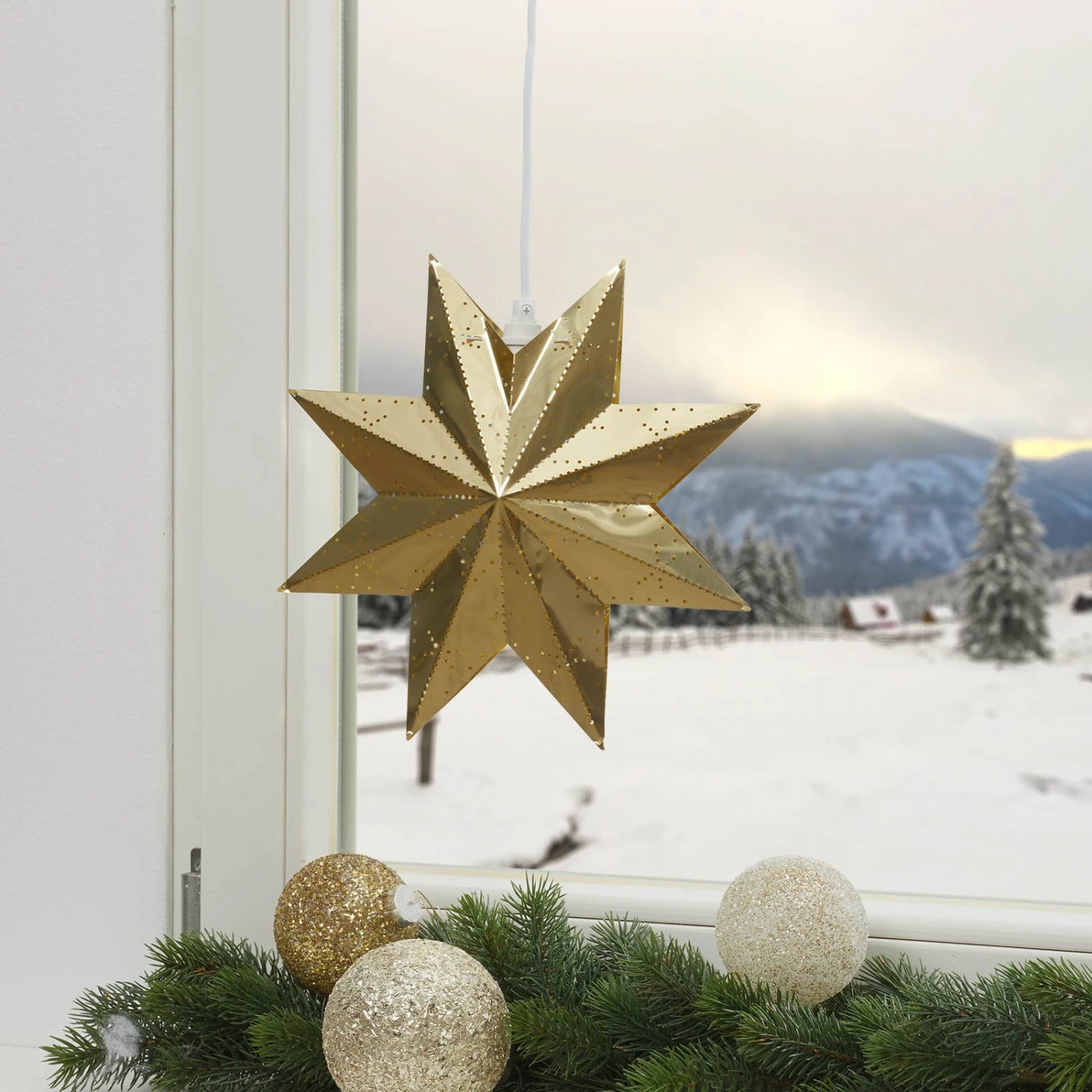 Dieser wunderschön gemusterte Stern strahlt eine ganz besondere vorweihnachtliche Stimmung aus und lässt die Vorfreude auf das Fest steigen. Er lässt sich vielseitig einsetzen und sorgt überall für eine behagliche Atmosphäre. Die Zuleitung ist weiß und beträgt 3,5 m.