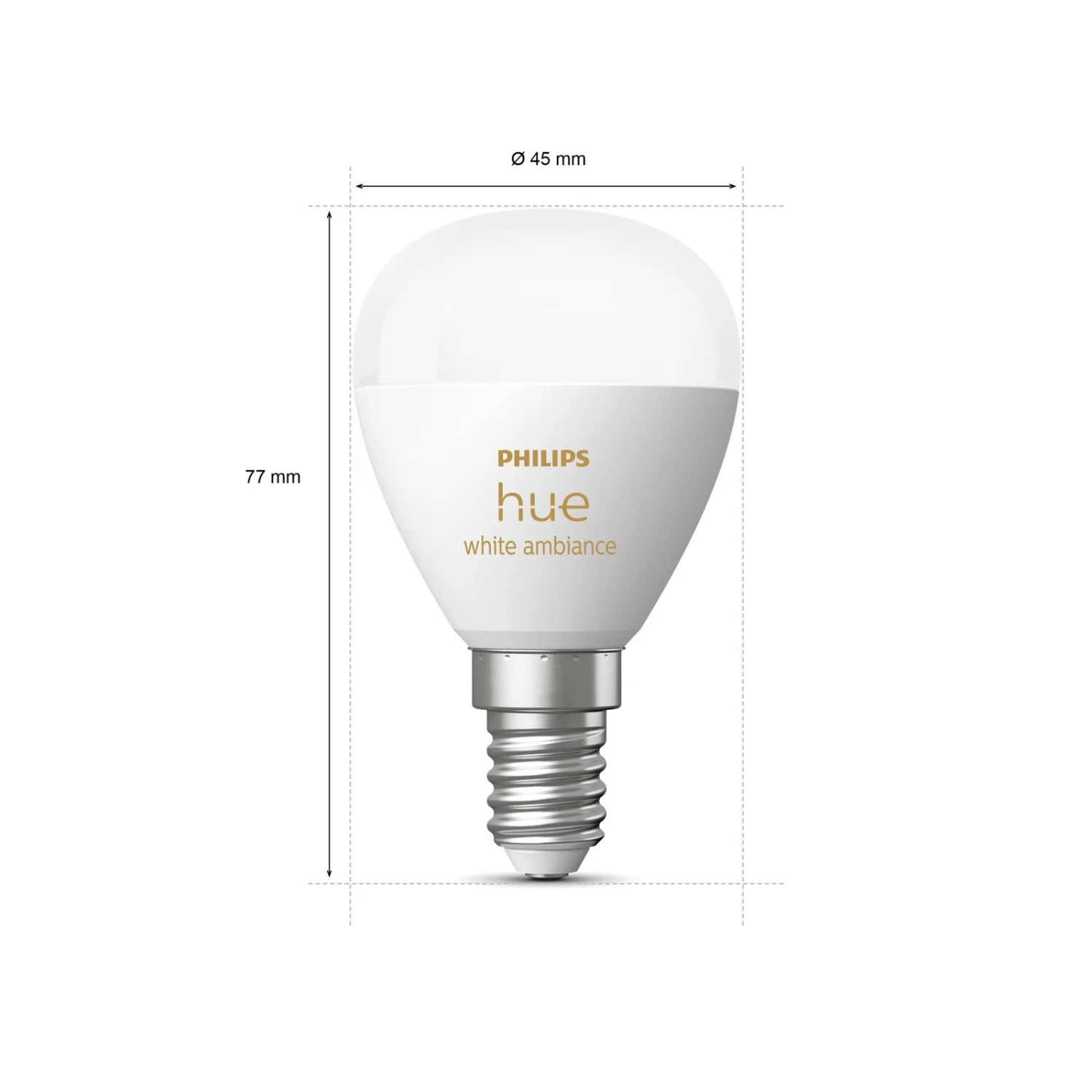 Egal, ob beim Entspannen oder beim TV schauen – die smarte Beleuchtung von Philips Hue verschönert die täglichen Momente und macht sie zu etwas ganz besonderem. Mit der Philips Hue White Ambiance E14-Lampe in Tropfenform können Lampen und Leuchten in das smarte Philips Hue Lichtsystem integriert werden. Die Lampe in Tropfenform ist etwa so groß wie ein Golfball. Daher passt sie auch dort hinein, wo längere E14-Lampen nicht genutzt werden können.