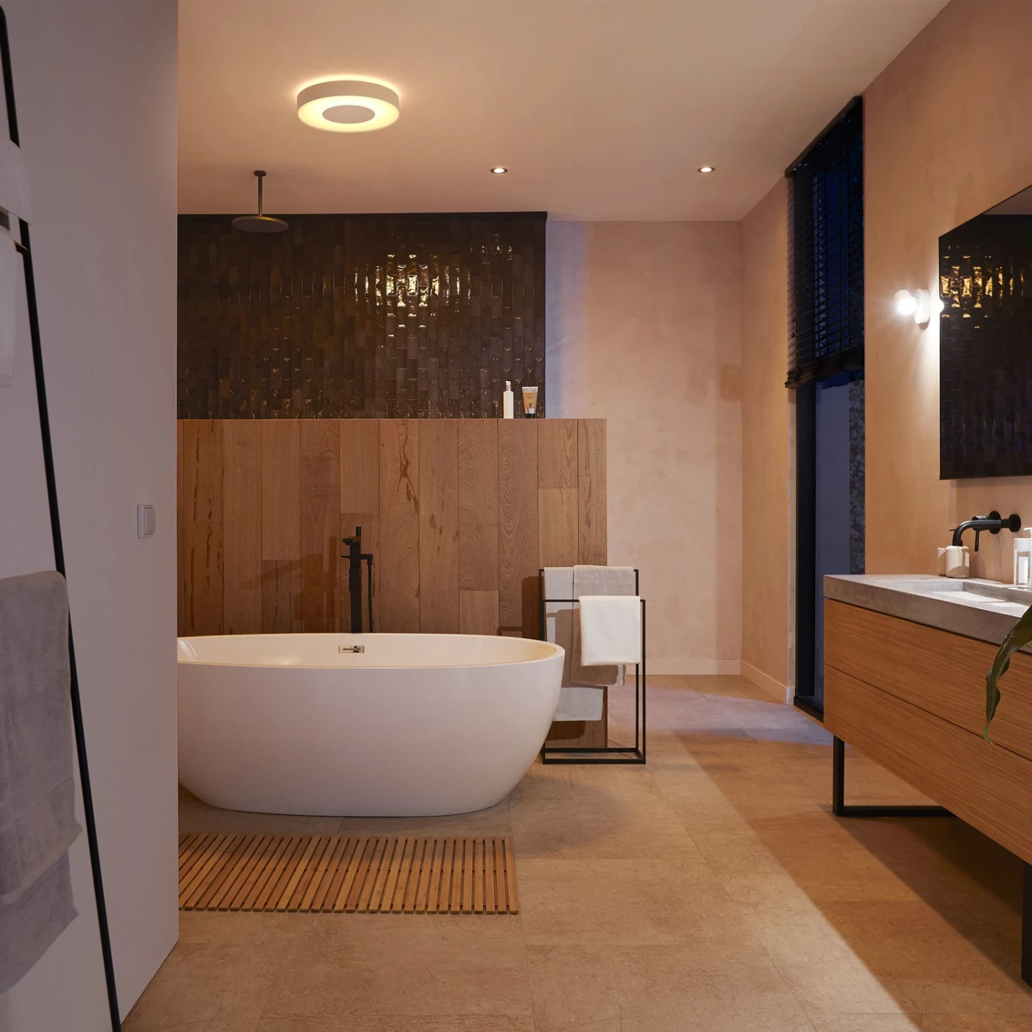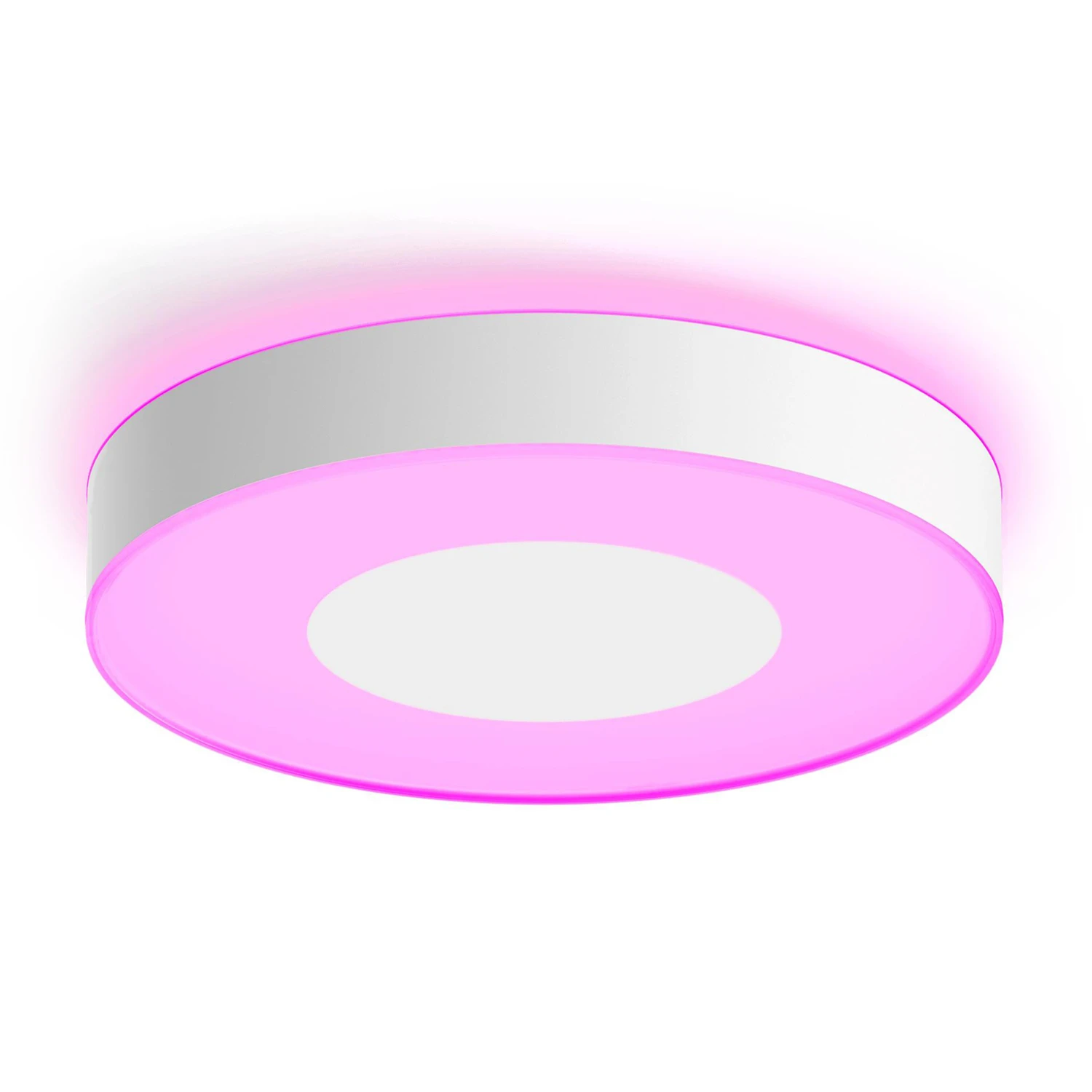 Philips Hue Xamento LED-Deckenleuchte – smart steuerbares, farbenfrohes Licht Schlichtes Design, gepaart mit moderner Funktionalität und fortschrittlichen Optionen zur Steuerung – die runde LED-Deckenleuchte Xamento ist die smarte Wahl für das moderne Wohnräume und Badezimmer. Sie bietet dank der integrierten LEDs mit White and Color Ambiance Technologie farbiges wie weißes Licht in unzähligen Schattierungen beliebiger Helligkeit. Nicht nur das Licht, auch die Steuerbarkeit ist absolut variabel. Xamento kann mit dem Hue Dimmschalter (siehe Zubehör) geschaltet und gedimmt sowie in vorkonfigurierte Lichtszenen geschaltet werden. Via Bluetooth ist eine direkte Ansteuerung mit dem Smartphone/Tablet möglich; die Hue Bluetooth App erlaubt zusätzlich die freie Regelung der Lichtfarbe. Das enorme Potenzial der smarten Lichtsteuerung eröffnet sich bei ZigBee-Einbindung mit der Hue Bridge (siehe Zubehör): Remote-Steuerung per App, Koppelung mit weiteren smarten Leuchten, Automatisierungen oder Sprachsteuerung können je nach Vorliebe eingerichtet werden. Besonderheiten / Kompatibilität – Schutzart: IP44 – dimmbar (per App, Dimmschalter (nicht enthalten) oder Sprachbefehl) – regelbare Lichtfarbe (warmweiß bis tageslicht, 16 Mio. bunte Abstufungen) – kompatibel mit vorhandenem Philips Hue System – steuerbar mit passender Hue-App (in Kombination mit Hue Bridge) und Hue Bluetooth-App (direkt mit Smartphone/Tablet) – kompatibel mit weiteren ZigBee-basierten Systemen, wie zum Beispiel Innogy, Bosch, Magenta (Telekom) und Busch-Jäger – intelligente Lichtsteuerung Option a: ZigBee-Einbindung über Bridge und Router, wie zum Beispiel die Philips Hue Bridge (siehe Zubehör); hierdurch wird die Steuerung vor Ort oder von unterwegs aus via Hue-App und die Möglichkeit zur Sprachsteuerung über Amazon Alexa, Apple HomeKit (Siri) und Google Assistant möglich. – intelligente Lichtsteuerung Option b: Direkte Ansteuerung vor Ort via Bluetooth mit kostenloser Hue Bluetooth-App. Bei Verwendung von mehr als zehn Lampen innerhalb der Bluetooth-Steuerung wird die Nutzung einer Bridge empfohlen.