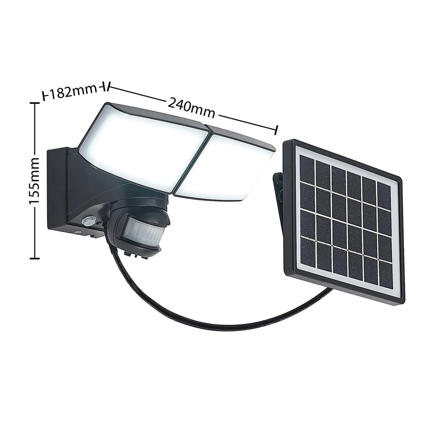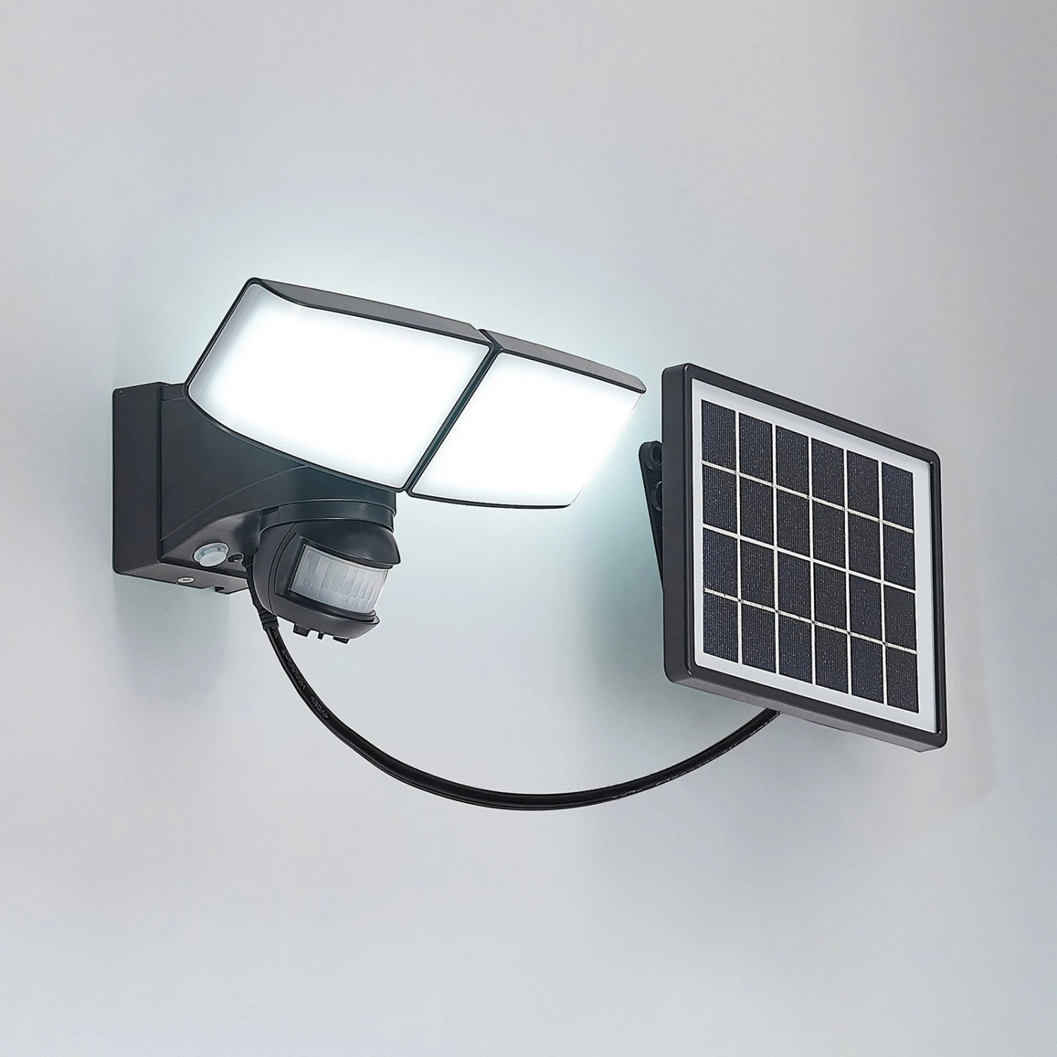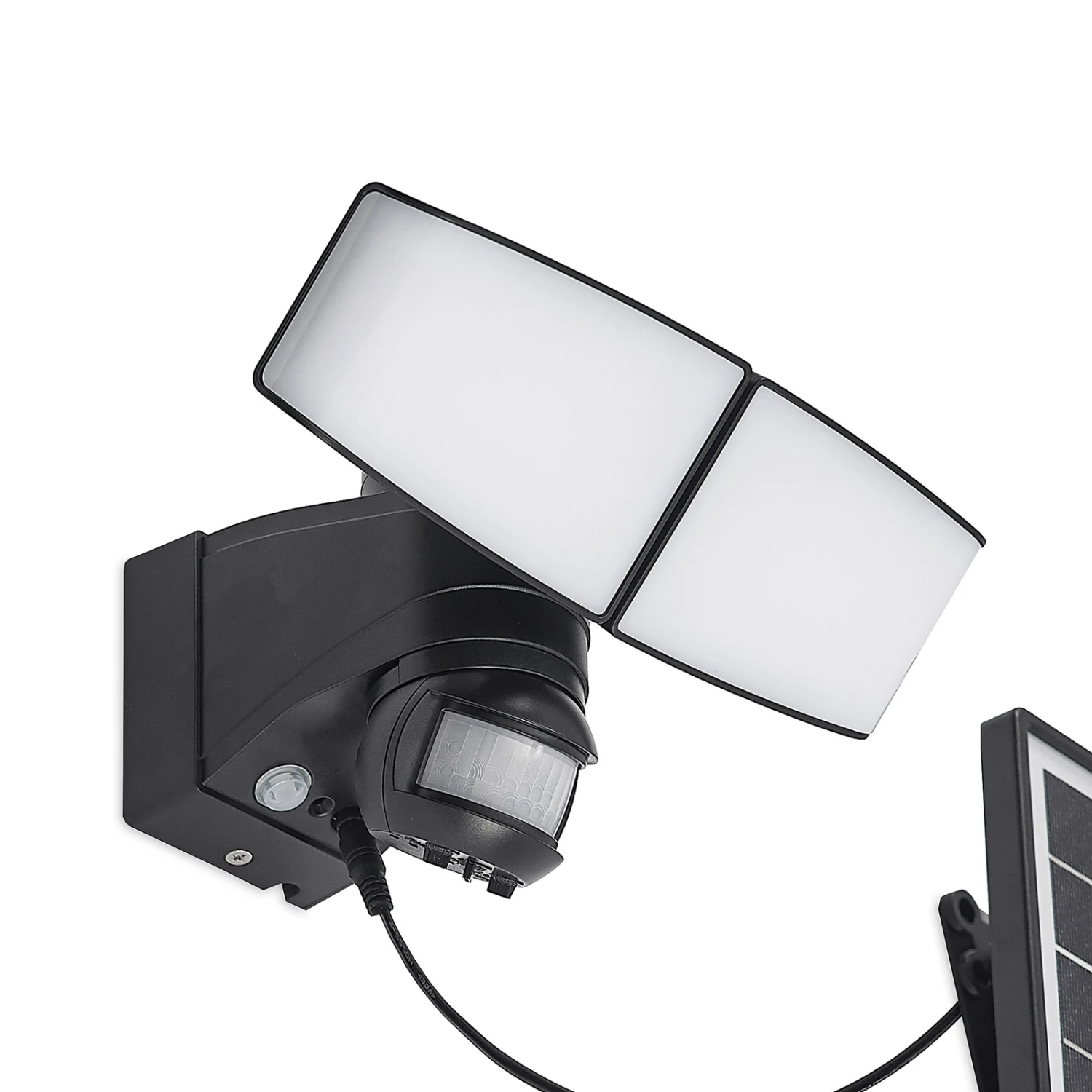 Der LED-Solar-Wandstrahler Kalvito wurde aus Kunststoff hergestellt und besitzt zwei leuchtstarke LED-Module, die mithilfe eines Solarpanels betrieben werden. Die LEDs bieten genügend Leuchtkraft in der Lichtfarbe Tageslicht, was gerade zu Abendstunden am Hauseingang oder an der Einfahrt äußerst praktisch ist. Die Spots sind bei Bedarf schwenkbar, wodurch der Abstrahlwinkel individuell bestimmt werden kann. Der integrierte Sensor registriert in einem Winkel von 140° und in einer Entfernung von maximal 10 Metern Bewegungen. Außerdem lässt die Leuchtdauer sich zwischen 3 Sekunden und 7 Minuten individuell einstellen. Die Schutzart IP44 sorgt für eine gute Langlebigkeit dieser Leuchte im Außenbereich.