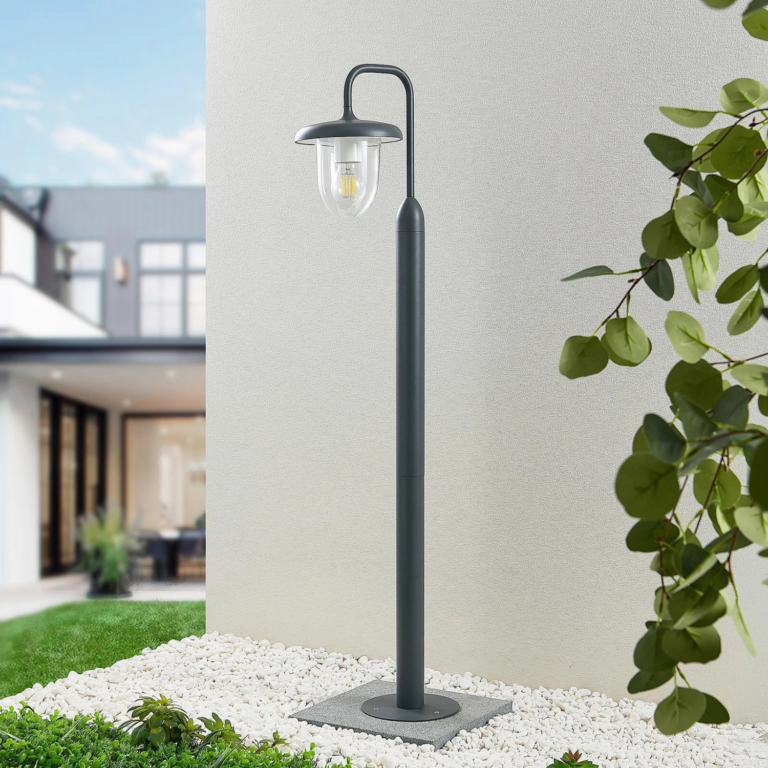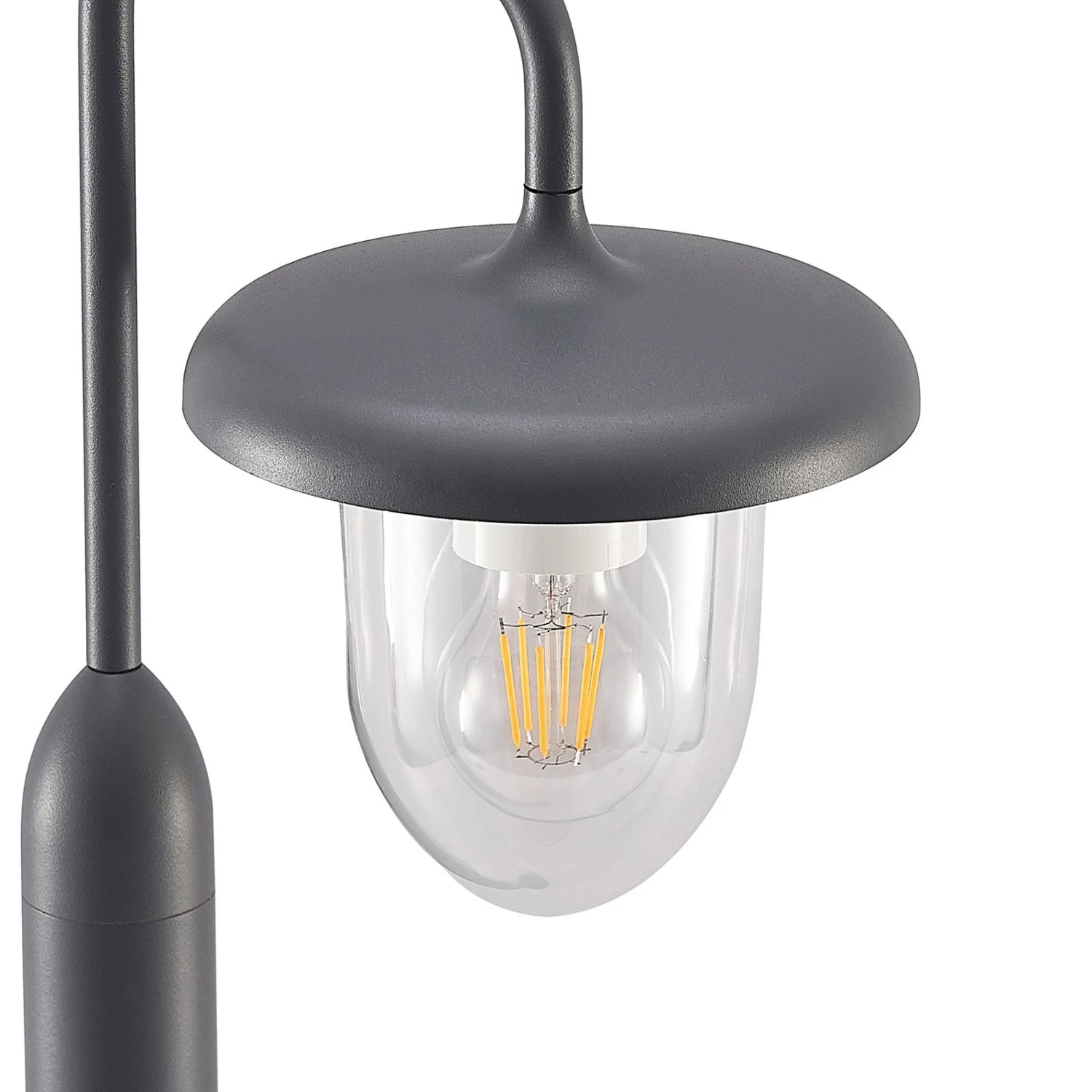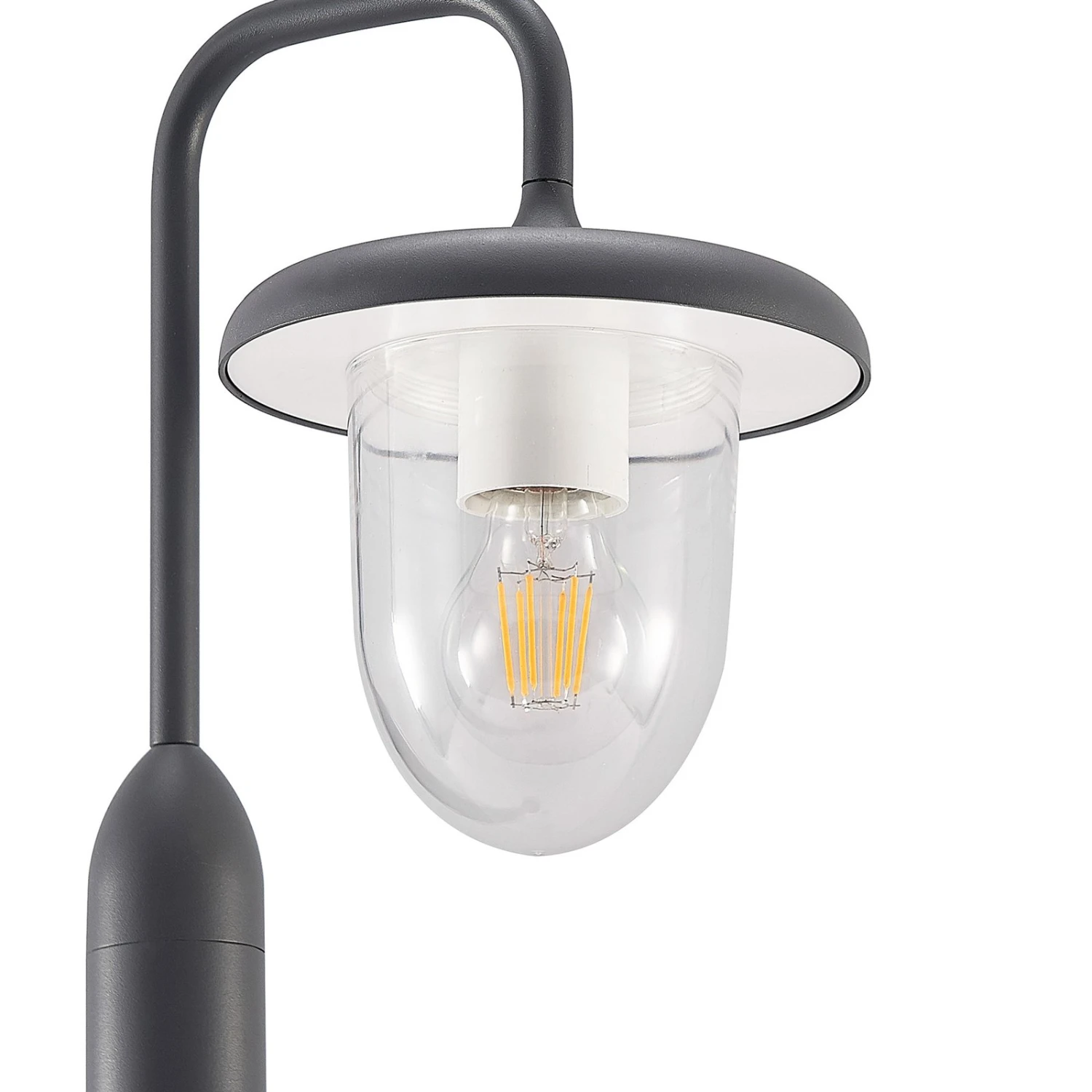 Die Wegeleuchte Larkumi wurde aus Aluminiumdruckguss hergestellt und mit einem dunkelgrauen Oberflächenfinish bearbeitet. Diese neutrale Farbgebung harmoniert mit unterschiedlichen Umgebungen und fällt nicht sofort ins Auge. An ihrem gebogenen Leuchtenarm ist ein wohlgeformter Leuchtenschirm befestigt, unter dem die E27-Fassung sitzt. Diese ist von allen Seiten gut sichtbar, sodass das einzusetzende Leuchtmittel das Licht rundum gleichmäßig abstrahlen kann. Da man eine freie Sicht auf das Leuchtmittel hat, sollte dieses entsprechend dekorativ gewählt werden, um den attraktiven Charakter dieser Wegeleuchte zu unterstreichen.
