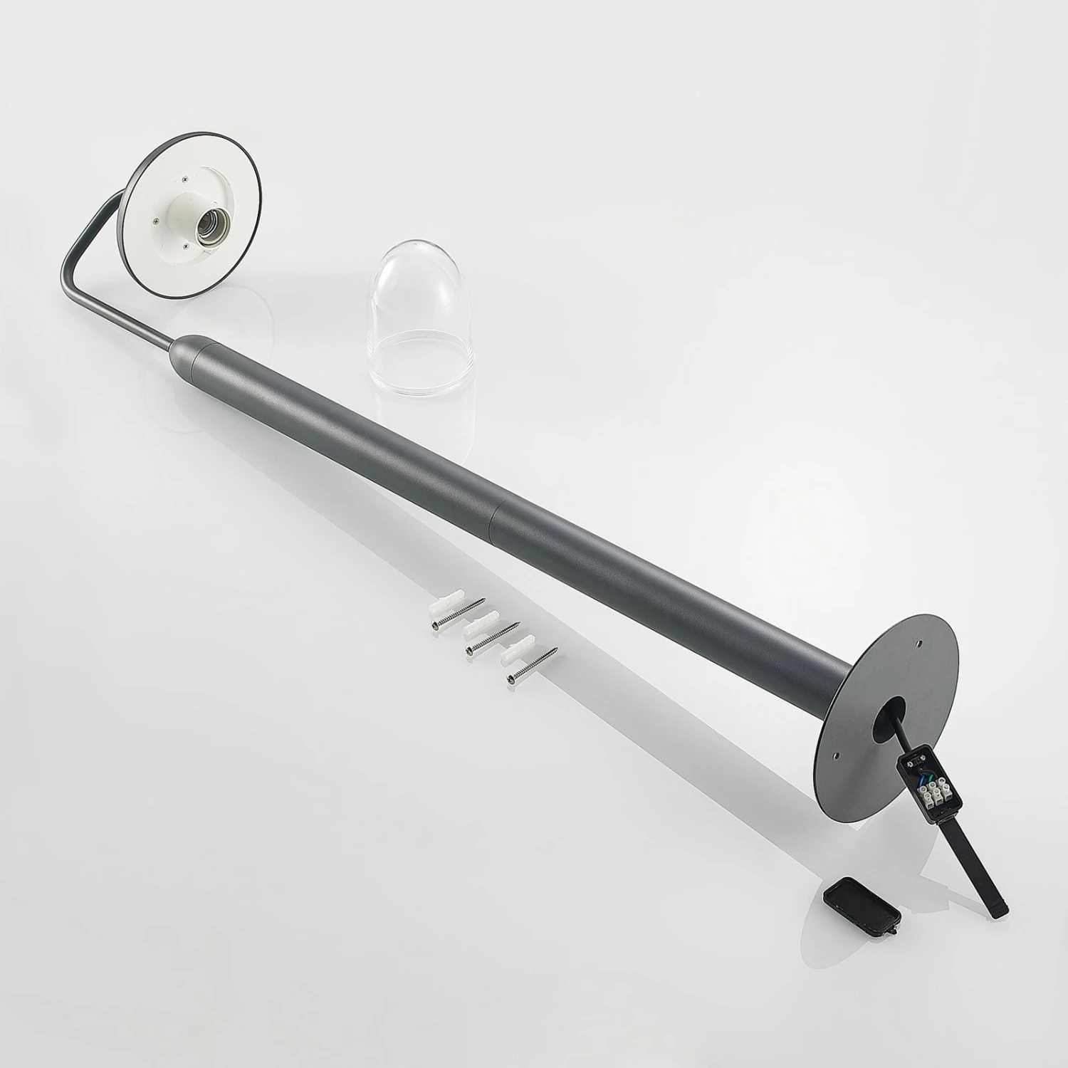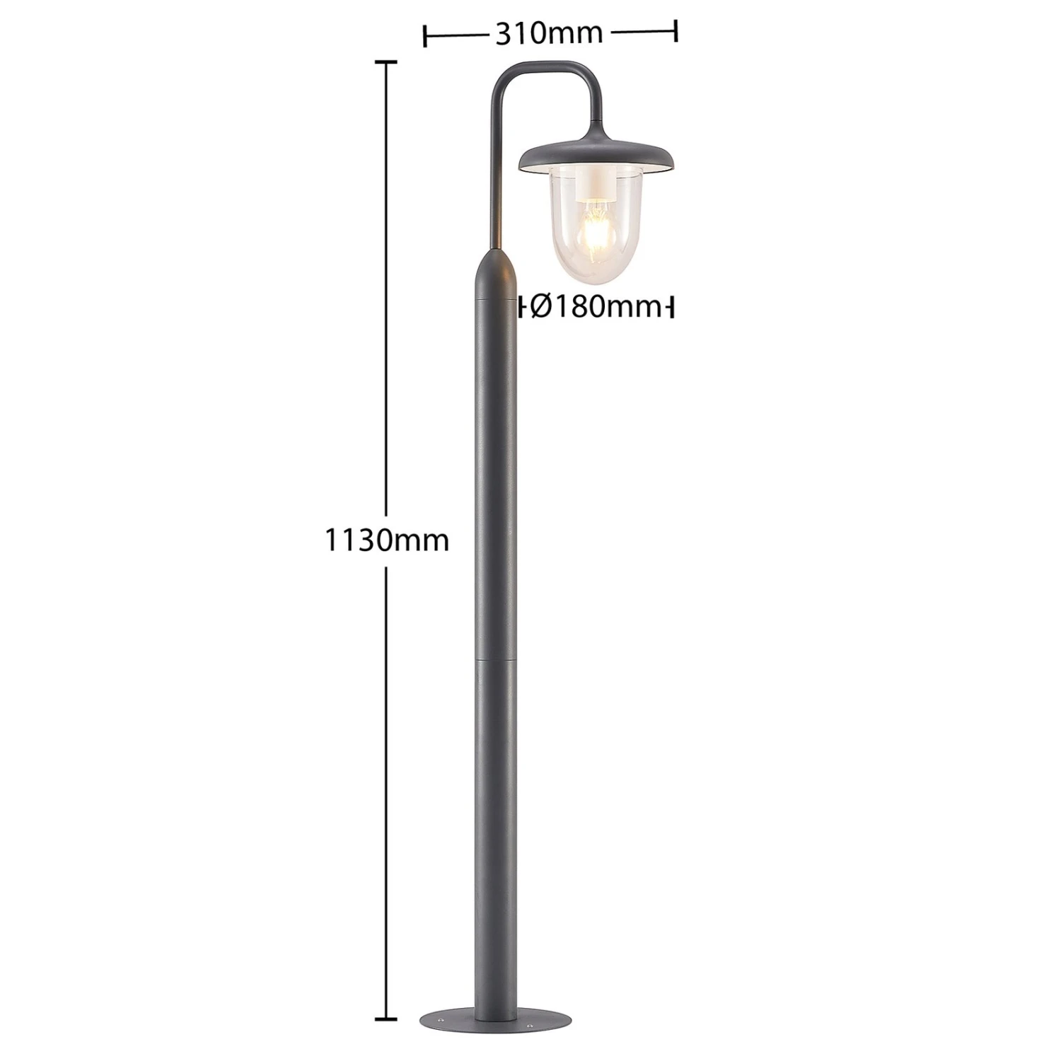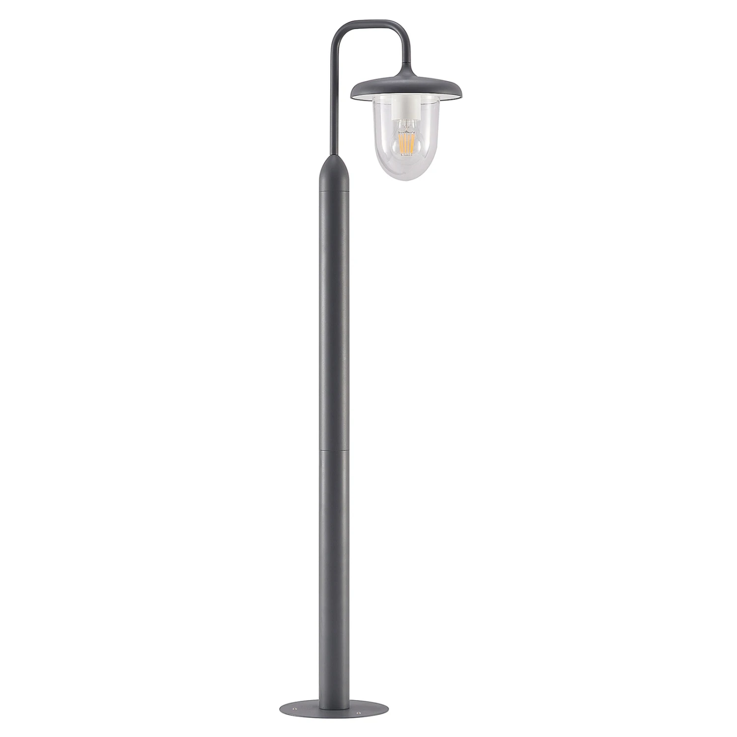 Die Wegeleuchte Larkumi wurde aus Aluminiumdruckguss hergestellt und mit einem dunkelgrauen Oberflächenfinish bearbeitet. Diese neutrale Farbgebung harmoniert mit unterschiedlichen Umgebungen und fällt nicht sofort ins Auge. An ihrem gebogenen Leuchtenarm ist ein wohlgeformter Leuchtenschirm befestigt, unter dem die E27-Fassung sitzt. Diese ist von allen Seiten gut sichtbar, sodass das einzusetzende Leuchtmittel das Licht rundum gleichmäßig abstrahlen kann. Da man eine freie Sicht auf das Leuchtmittel hat, sollte dieses entsprechend dekorativ gewählt werden, um den attraktiven Charakter dieser Wegeleuchte zu unterstreichen.