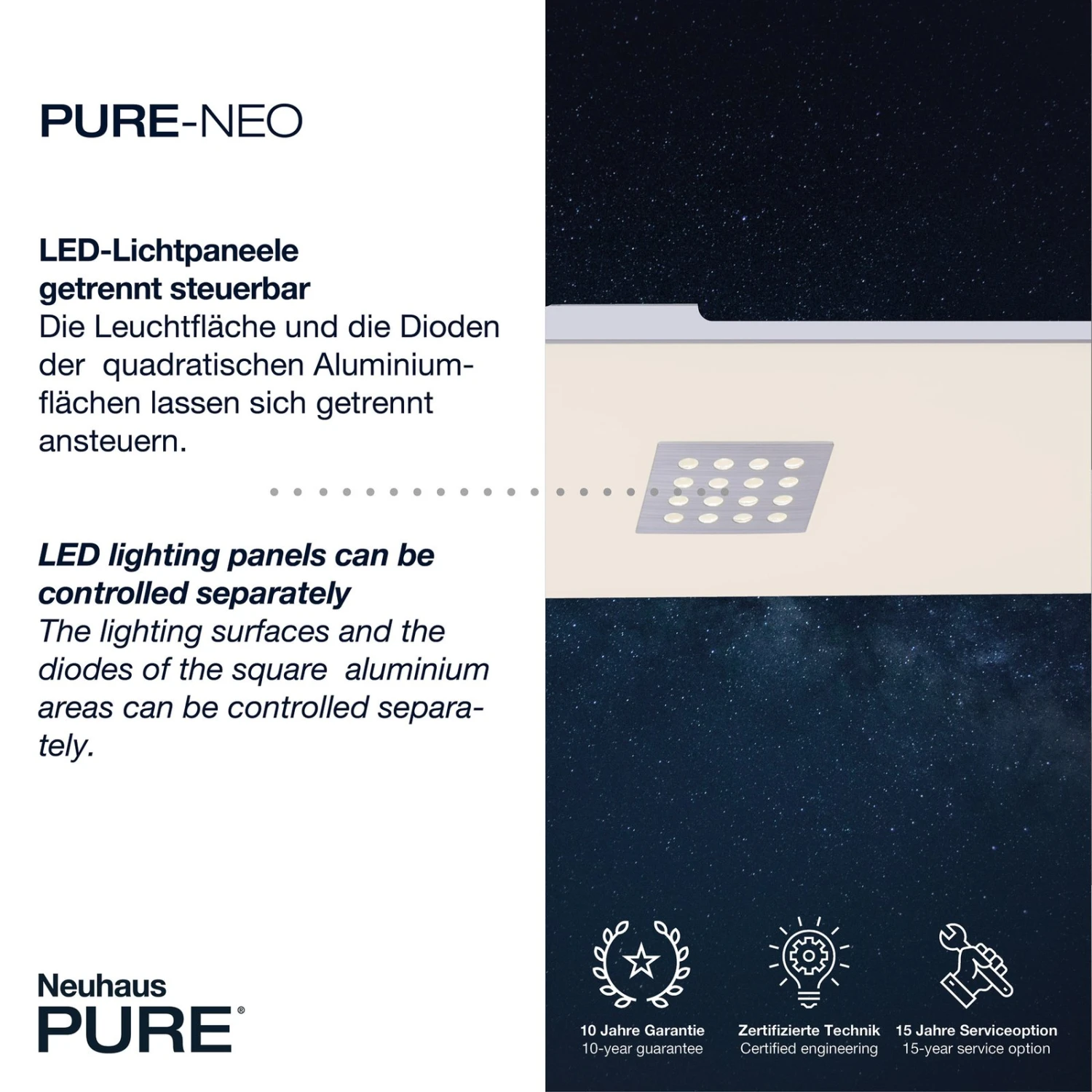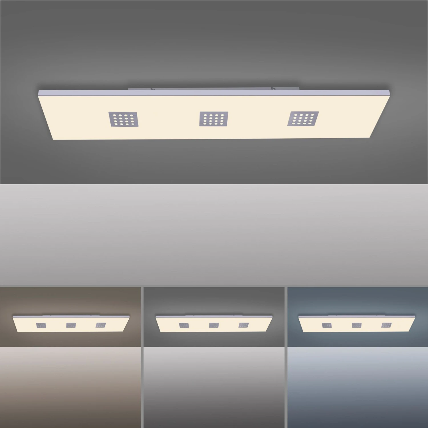 Das rechteckige LED-Panel Pure-Neo bietet eine flexibel einstellbare Beleuchtung dank der CCT-Funktion, die eine Auswahl der Lichtfarbe im Bereich von warmweißem bis zu universalweißem Licht bietet, der stufenlosen Dimmbarkeit und der getrennten Schaltmöglichkeiten der einzelnen LED-Boards. Die Leuchte wird mit einer Fernbedienung geliefert, mit der sich neben der Einstellung von Lichtfarbe und Helligkeit auch die einzelnen LED-Boards getrennt voneinander schalten lassen. So können entweder die drei mit gelochten Aluabdeckungen versehenen LED-Boards oder auch das Board hinter der satinierten Fläche geschaltet werden. Diese variablen Lichteinstellungen ermöglichen den Einsatz der Leuchte in den unterschiedlichsten Räumen und die Anpassung des Lichts an jede Situation, ob helle Arbeitsbeleuchtung oder sanftes Licht zum gemütlichen Beisammensitzen am Abend. Außerdem bietet die Fernbedienung eine Nachtlichtfunktion und einen Timer.