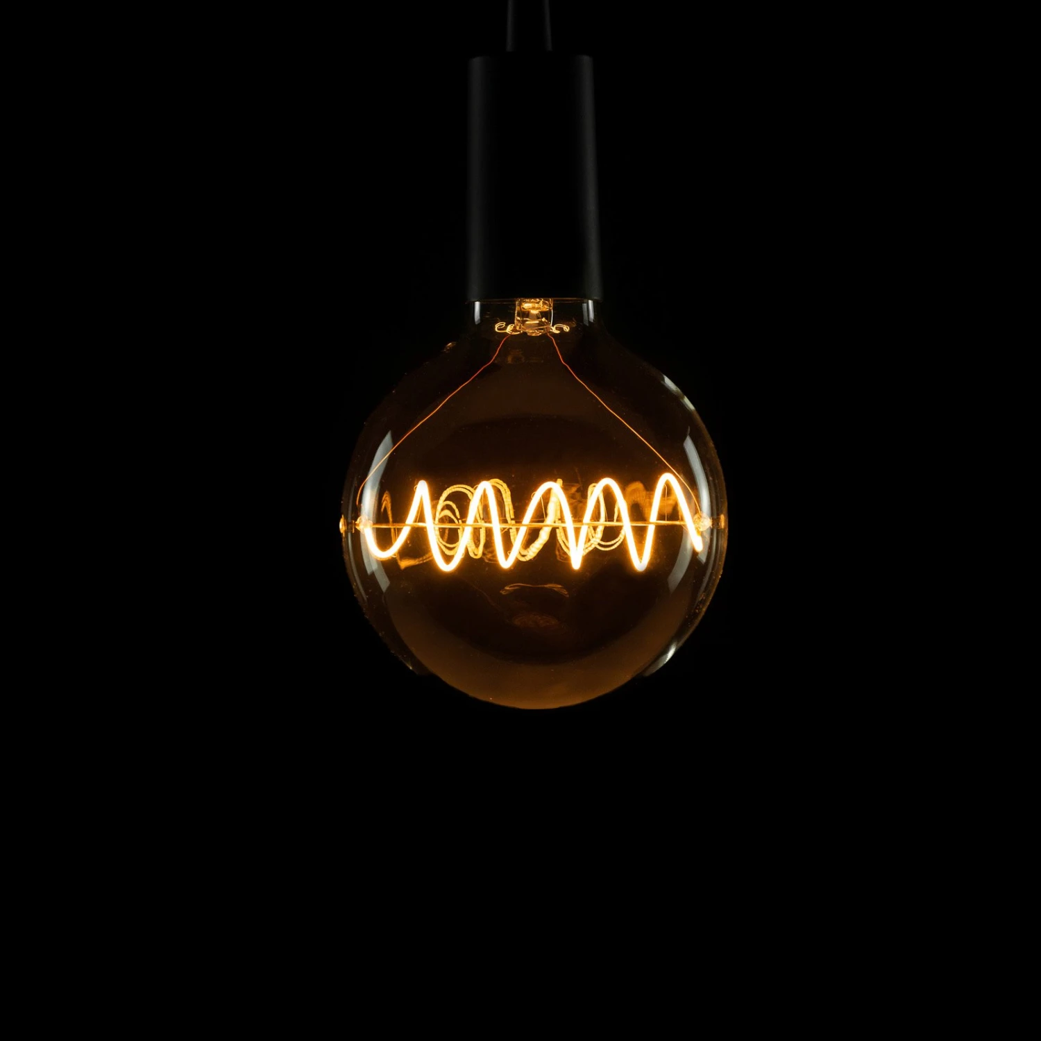 Im transparenten Glas dieser LED-Globelampe wurden extra warmweiße LEDs in ganz besonderer Anordnung verbaut. Sie Bilden eine Spirale, die in der Mitte des Glases horizontal verläuft. Ein besonderes Leuchtmittel für schirmlose Leuchten aller Art, das sich durch eine besonders gute Farbwiedergabe auszeichnet und dimmen lässt.