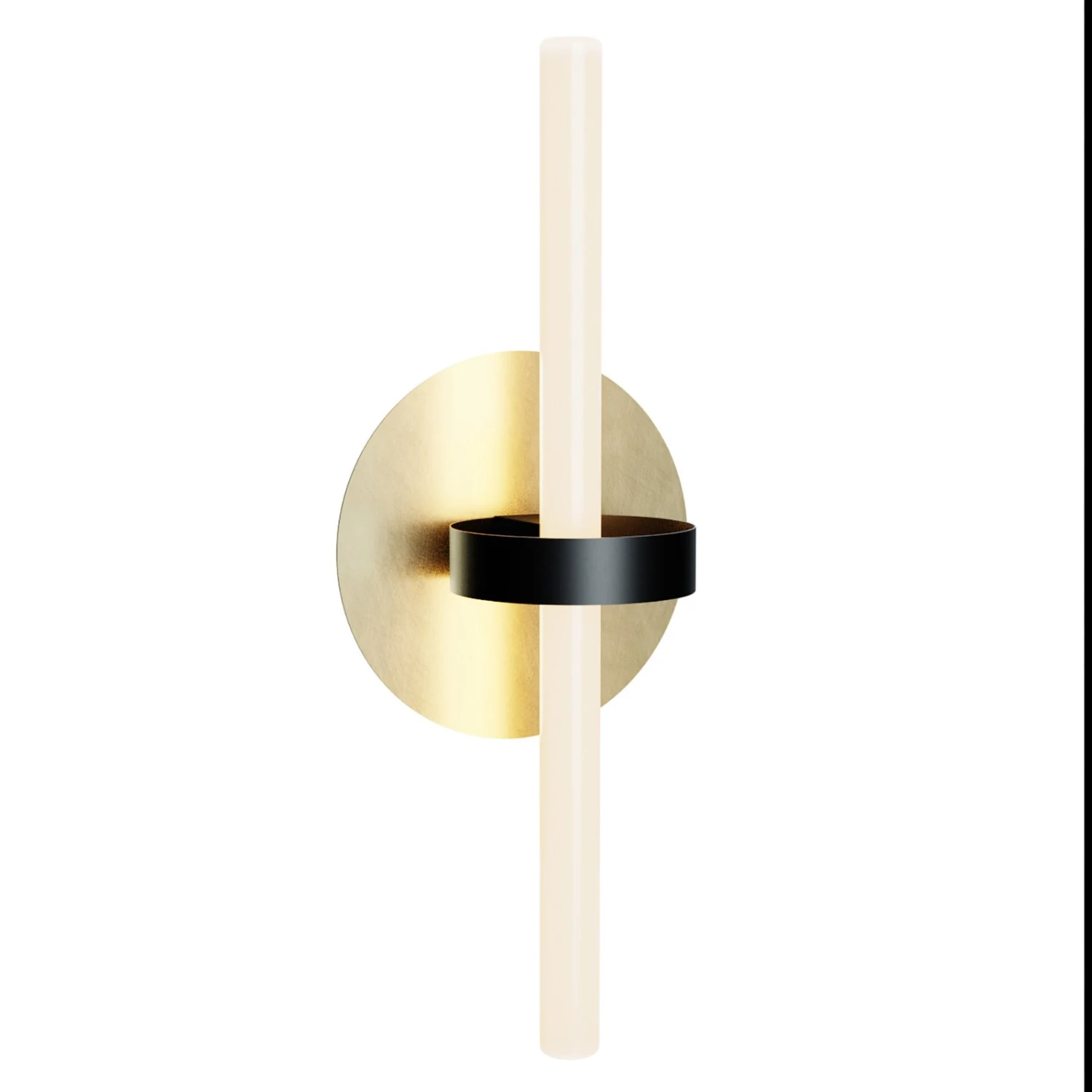 Die Wandleuchte Equator besteht aus einem flachen, runden Wandhalter aus Stahl mit goldfarbenem Finish und einem darauf angebrachten, ausladenden Ring in Schwarz, in dem die Fassung für das Leuchtmittel, eine S14d Linienlampe, sitzt. Ihre Optik und auch die Lichtwirkung lässt sich je nach Wahl des Leuchtmittels variieren. Die Wandleuchte kann sowohl in senkrechter als auch in waagerechter Ausrichtung montiert werden.