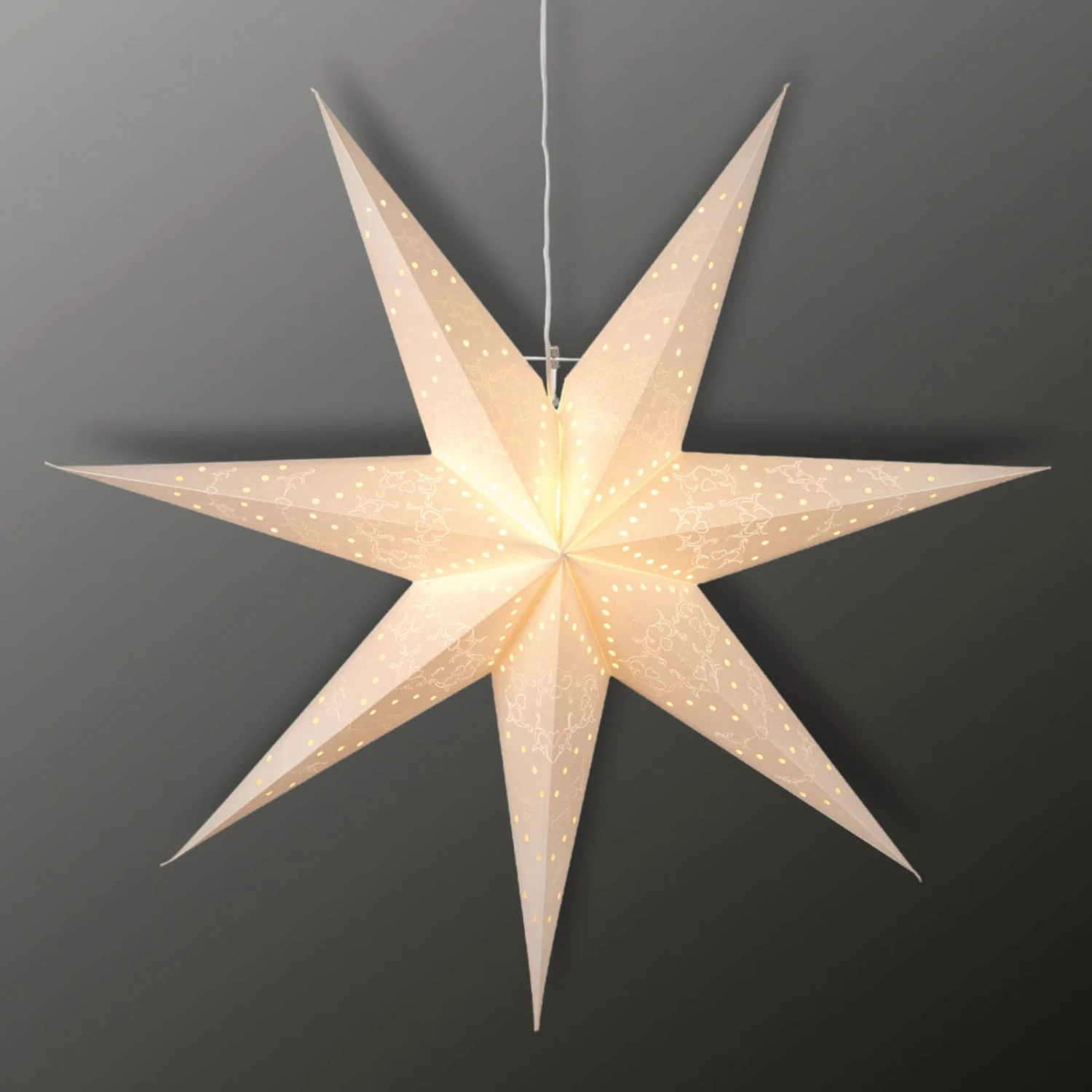 Sobald die Adventszeit beginnt, werden Fenster und Wohnräume mit dekorativem Weihnachtsschmuck ausgestattet. Wunderbar eignet sich hierzu die schöne Dekorationsleuchte Sensy Star. Ihr Leuchtenschirm ist aus Papier in der Farbe Creme gefertigt. Die prachtvoll siebenzackige Sternform ist mit einem feinen Lochmuster versehen, aus dem feiner Lichterglanz hervortritt. Die schmückende Leuchte mit einem Durchmesser von 70 cm kann sich auch zu anderen Gelegenheiten einsetzen lassen – sei es beim Lampionfest oder als Nachtleuchte für Kinder.