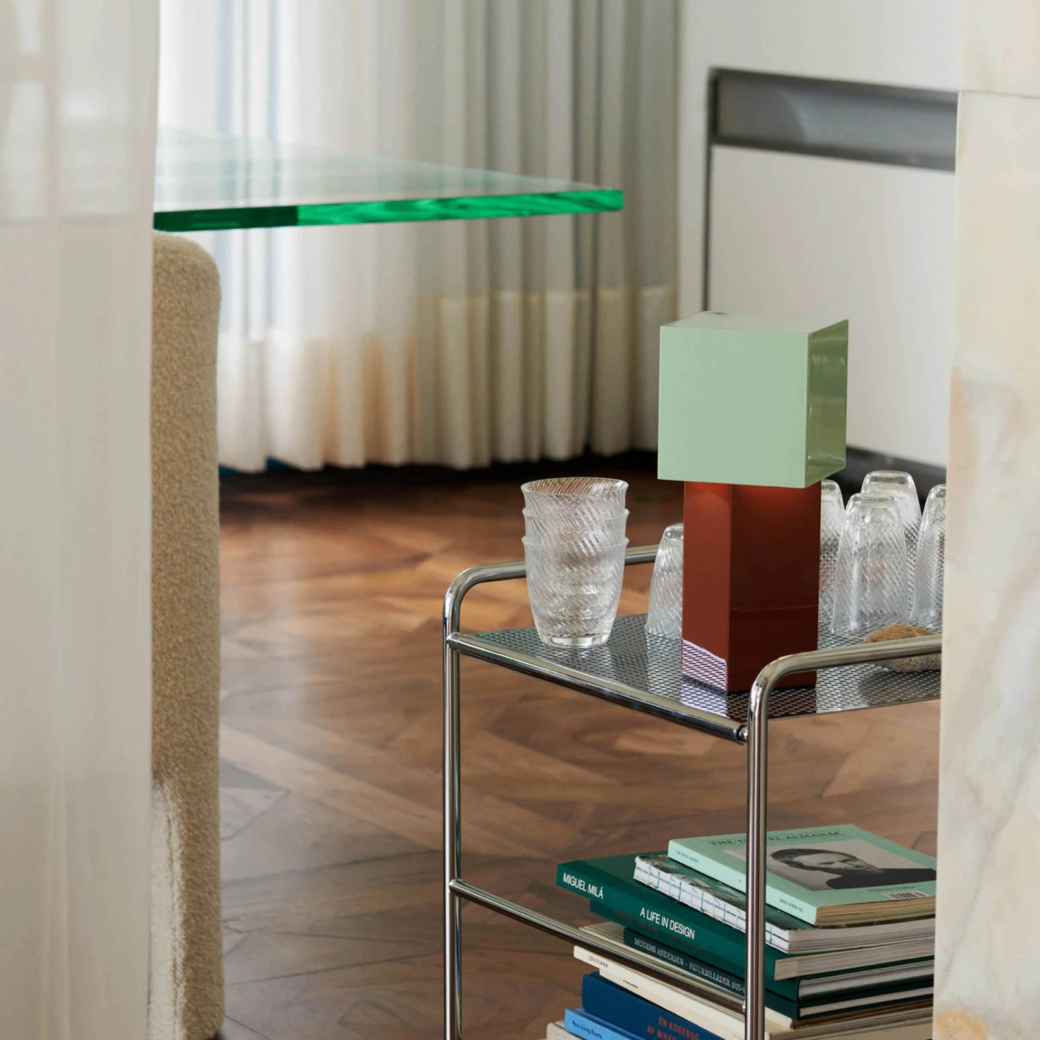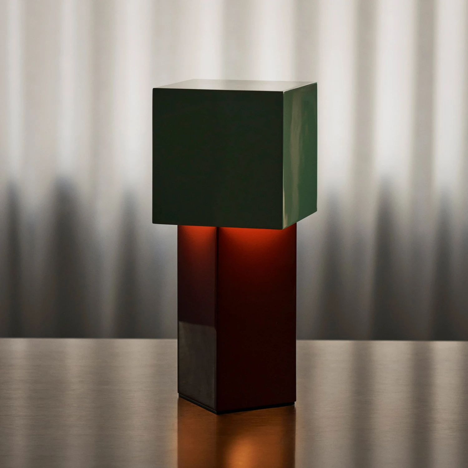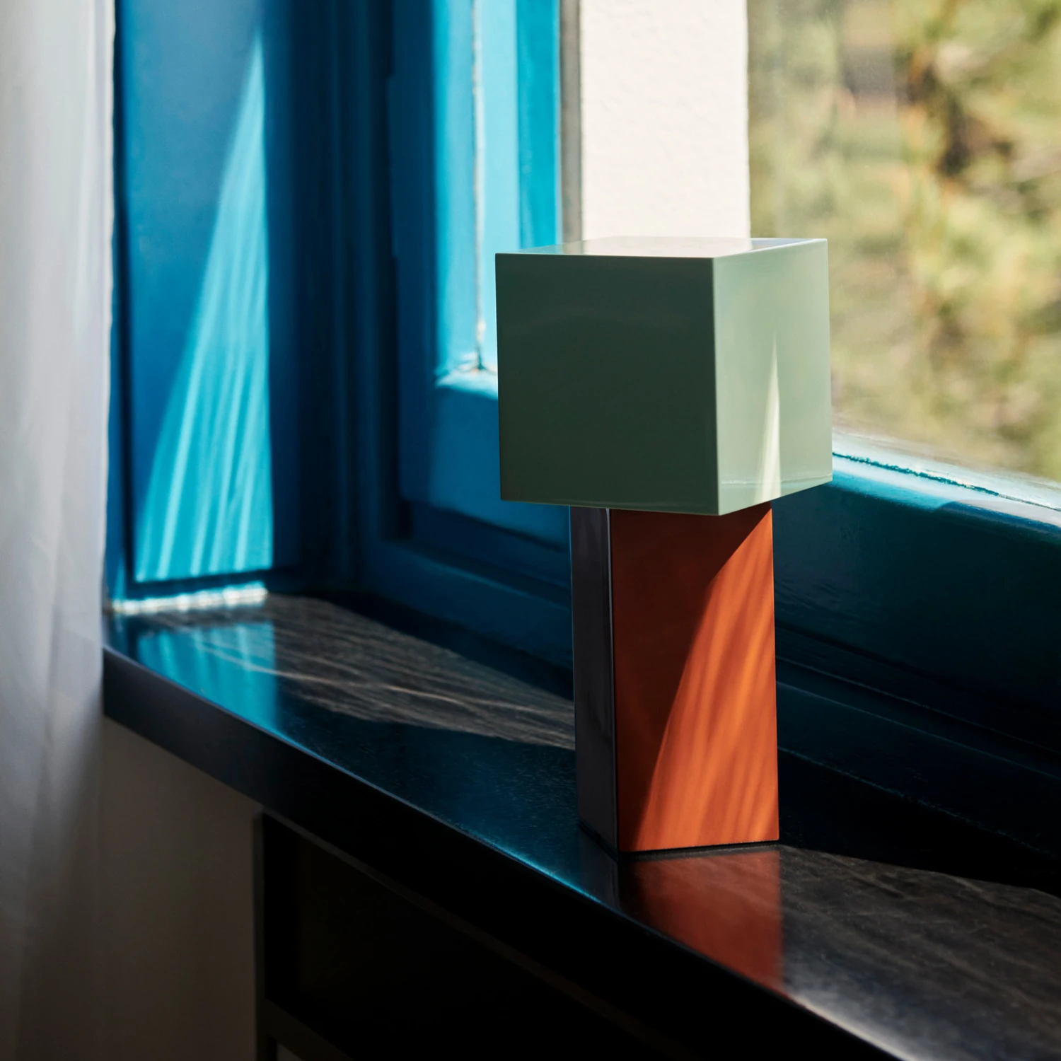 Die tragbare Tischleuchte Pivot verbindet Skulptur und Licht. Der geometrische Schirm der Leuchte ist in einem 45-Grad-Winkel zum Sockel positioniert, wodurch eine weiche Diffusion entsteht, die den warmen Schein einer modernen Kerze nachahmt. Das Ergebnis ist ein schönes Licht, das eine einladende Atmosphäre ausstrahlt.