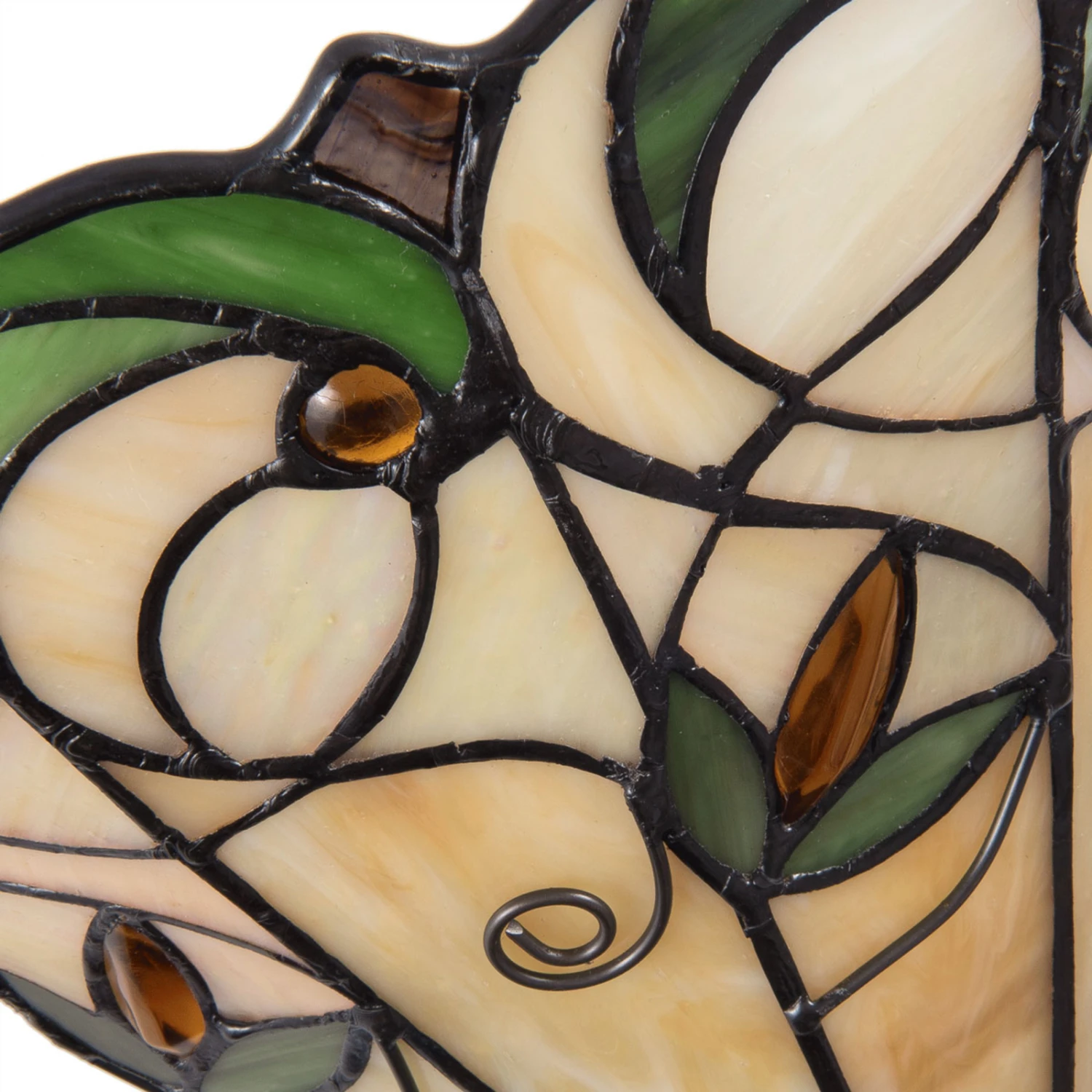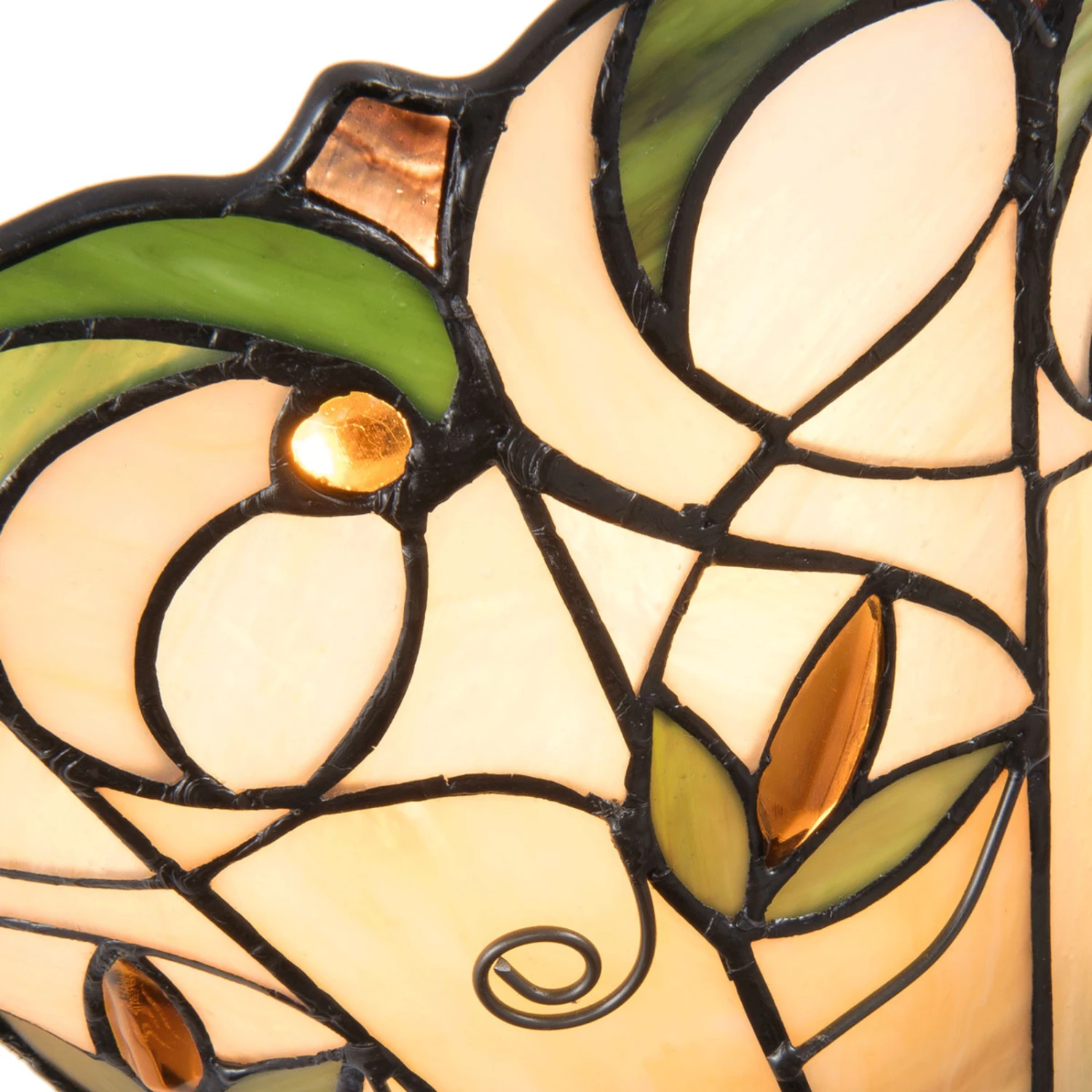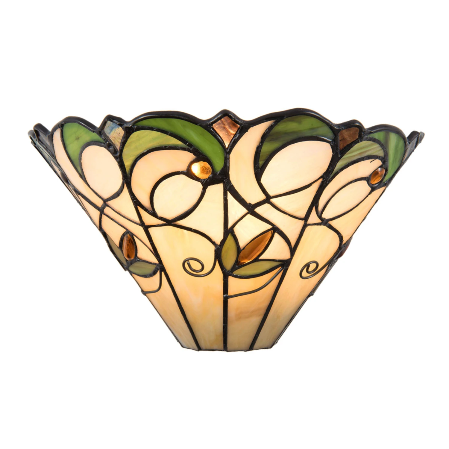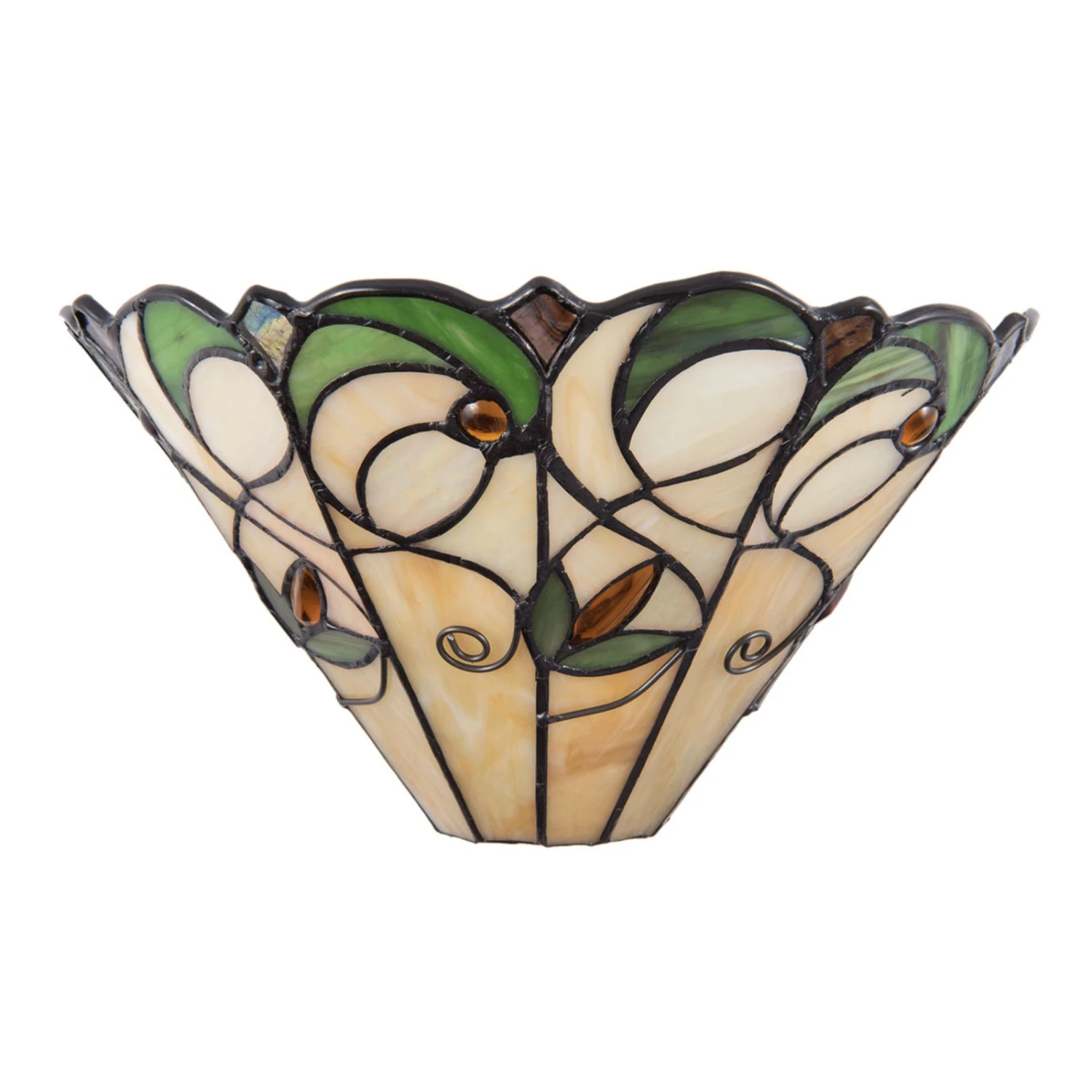 Den Glasschirm der Wandlampe 5208 ziert ein florales Dekor aus Grün- und Brauntönen. Die für Tiffany-Leuchten aufwendige Gestaltung der Glasschirme fällt auch bei 5208 jedem Betrachter ins Auge. Das Licht wird nach oben hin abgestrahlt und fällt gleichzeitig durch den bunten Glasschirm.