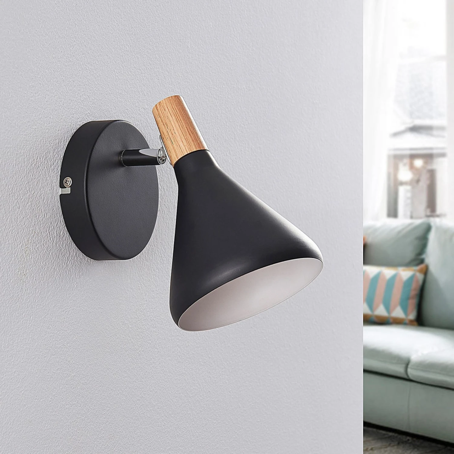 Eine Kombination aus schwarzem Metall und hellem Holz: die Wandleuchte Arina