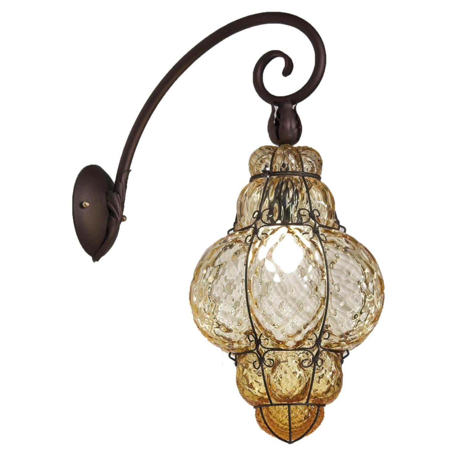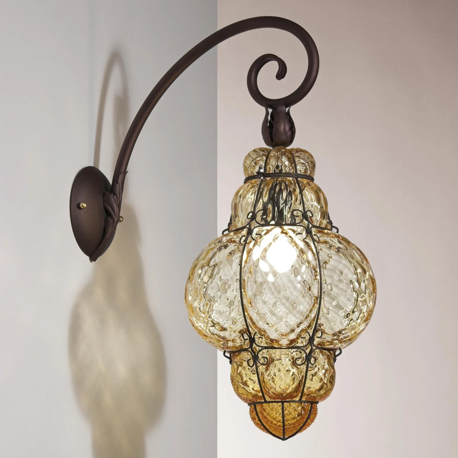 Von Hand wurde die hochwertige Wandleuchte Classic auf traditionelle Weise in Italien hergestellt. Sie stellt durch ihre Größe und den an einem ausladenden Arm hängenden Schirm in Form einer Traube eine imposante Erscheinung dar und wird zum Blickfang an jeder Wand. Die Wandhalterung und der ausladende, geschwungene Arm der Leuchte bestehen aus Metall mit antikem, rostbraunem Finish, der einzigartig gestaltete, strukturierte Leuchtenschirm aus amberfarbenem, mundgeblasenem Glas. Der Schirm sitzt in einem zierenden Metallgitter, durch dessen Öffnungen er sich einzigartig wölbt. Um die Beleuchtung entgegen der antiken Optik auf moderne, energiesparende Weise zu realisieren, kann die Wandleuchte statt mit herkömmlichen Glühlampen bis 100 W mit zeitgemäßen LED-Lampen bestückt werden.