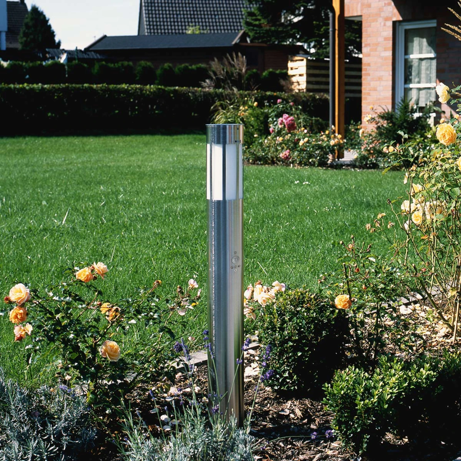 Die zylinderförmige, lange Wegeleuchter 475 ist ein Erzeugnis eines deutschen, traditionsreichen Leuchtenherstellers. Seine Produkte sind von jeher bekannt für ihre wertbeständige und stabile Verarbeitung, welche sie auch den hochwertigen Rohstoffen zu verdanken haben, die bei dem Hersteller Verwendung finden. Außerdem werden alle Produkte in der deutschen Heimat der Manufaktur angefertigt. Die elegante Wegeleuchte 475 ist ein äußerst attraktiver Blickfang, denn der edle Edelstahl und das hochwertige Glas fügen sich wunderbar zu einem harmonischen Gesamtbild zusammen. Die funktionale Wegeleuchte ist mit einem Bewegungssensor ausgestattet, welcher neben der hellen Leuchtkraft der Leuchte für zusätzliche Sicherheit sorgt. Die Nennspannung des Bewegungsmelders beträgt 230V/50Hz, die maximale Schaltleistung beläuft sich auf 1000W. Der Eigenverbrauch beträgt in etwa 1,5W. Der Erfassungsbereich ist 110 Grad, die Reichweite hängt von Montagehöhe, Temperatur und Annäherungsrichtung ab und beträgt ca. 8 bis 10 Meter. Die Zeiteinstellung ist, wie auch die Helligkeitseinstellung (von 5 – 1000 Lux) stufenlos variierbar (von 2 Sekunden bis 20 Minuten). Außerdem ist die Leuchte mit Schutzart IP44 ausgerüstet. Die Montage ist an vielen Orten möglich (auf Fundament oder Erdstück 4001013).