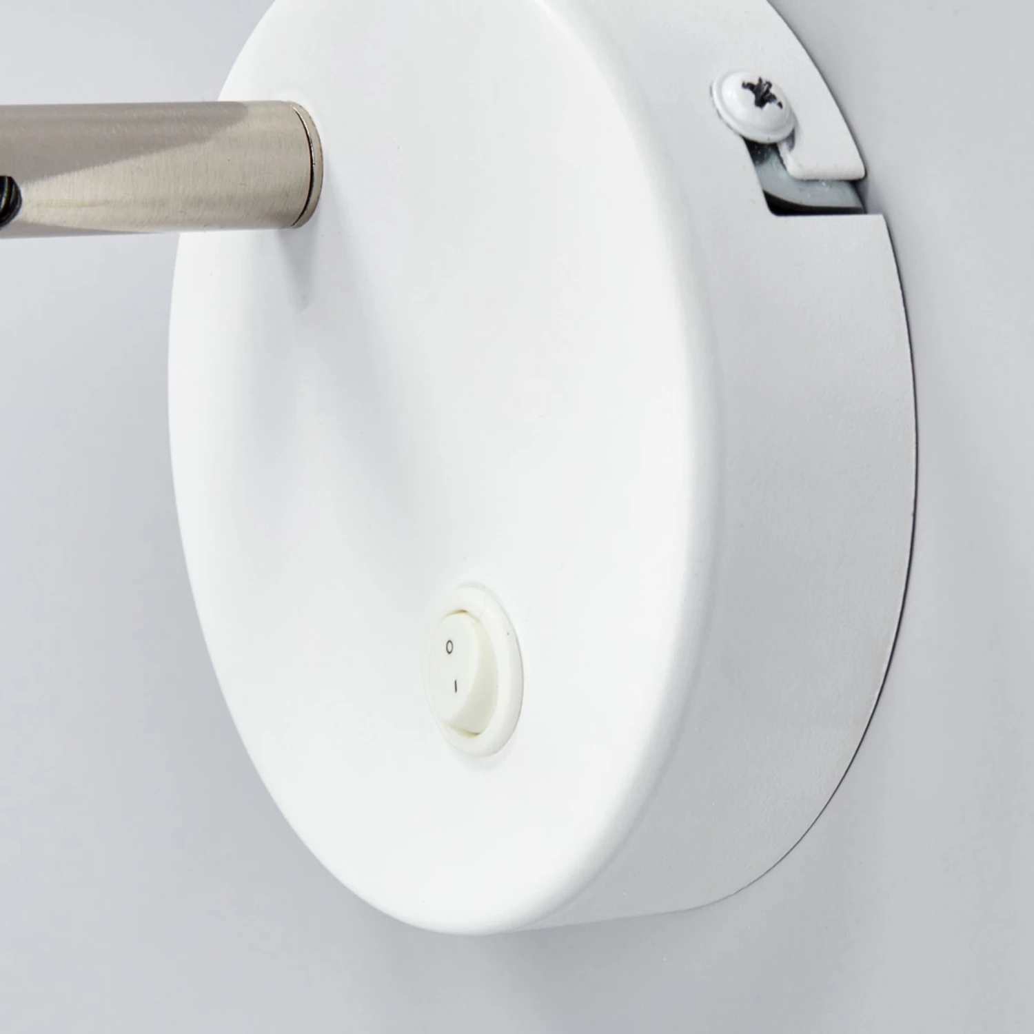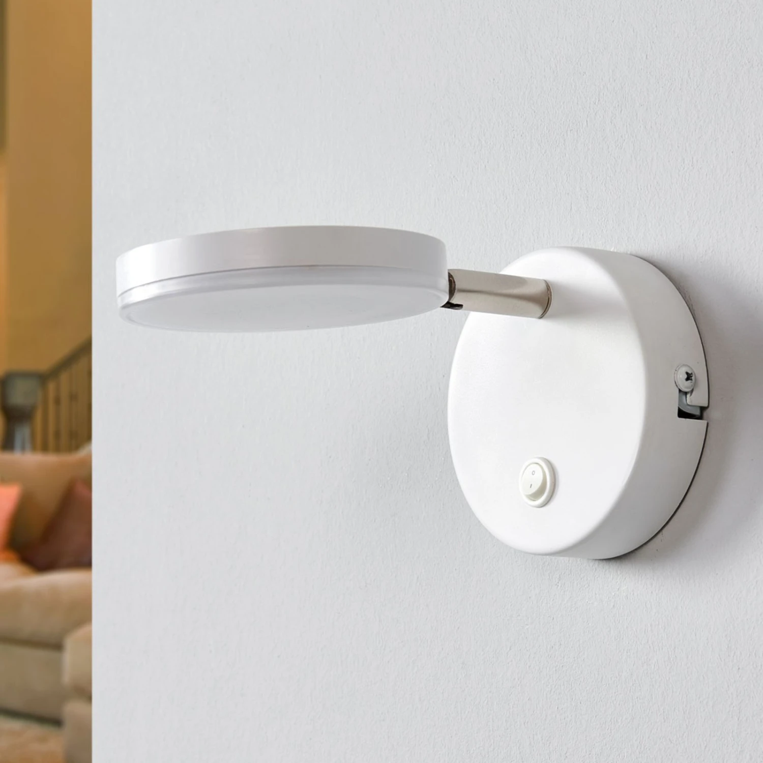 Milow besitzt einen beweglichen Leuchtkopf, der gedreht und geschwenkt werden kann, weil er über ein Gelenk mit der Wandhalterung verbunden ist. Ebenso rund und weiß wie der Schirm ist die Wandhalterung, die mit einem Schalter versehen worden ist, so dass man die LED-Wandlampe bequem vor Ort bedienen kann. Das macht sie zu einem hervorragenden Lichtspender in der Nähe eines Sofas oder Bettes, denn so kann man das Licht ein- oder ausschalten, ohne dafür aufstehen zu müssen.