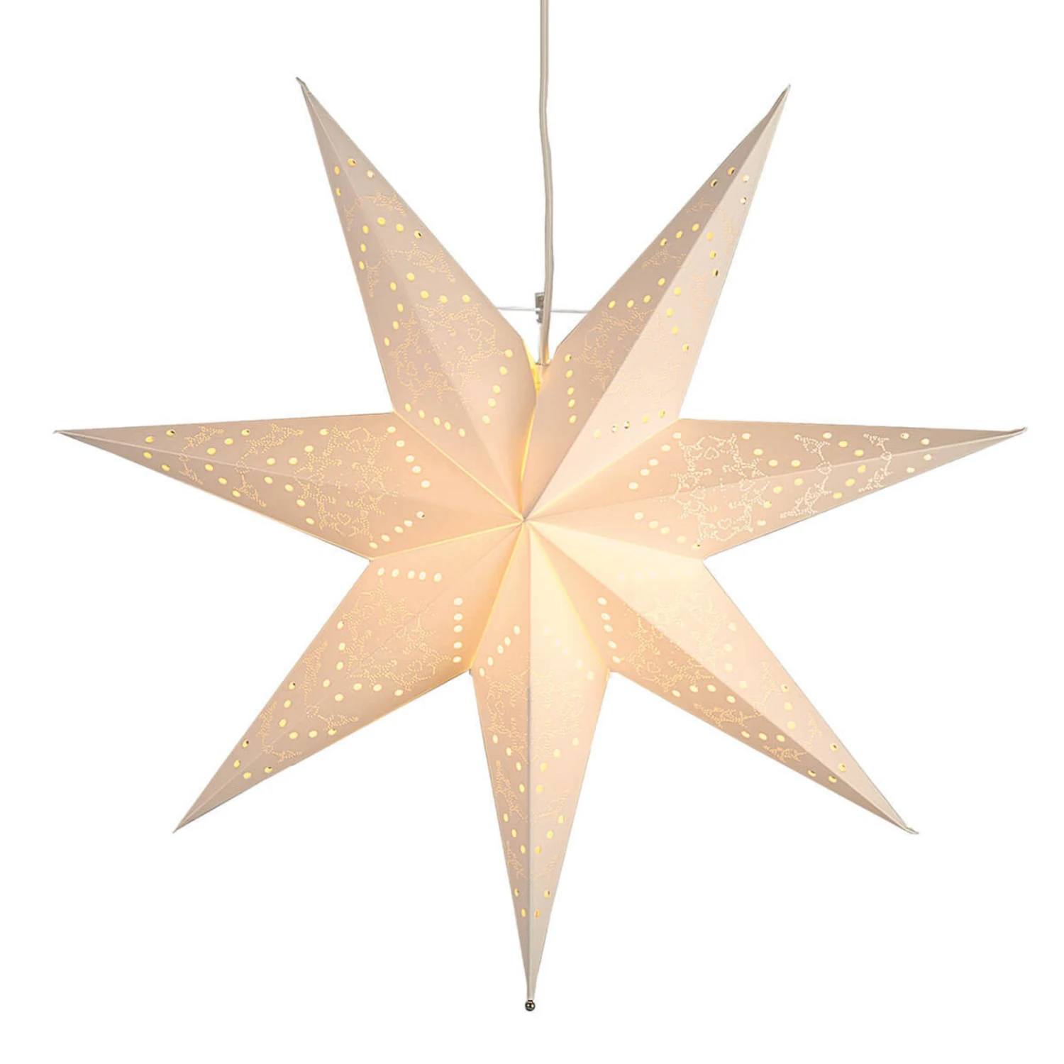 Dieser wundervoll gemusterte, siebenzackige Stern weist einen Durchmesser von 54 cm aus und ist sowohl eine tolle Fensterdekoration als auch ein stimmungsvoller Raumschmuck für die Winter- und Weihnachtszeit. Eine E14-Fassung mit Zuleitungskabel ist bereits integriert. Das passende Leuchtmittel kann über Zubehör mitbestellt werden. Es ist kein Bestandteil des Lieferumfangs.